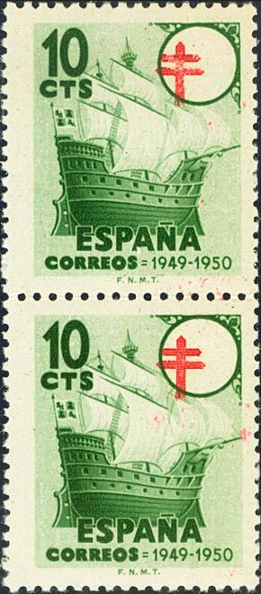 ★★ 1067ip(2). 1949. 10 cts verde, pareja. Variedad CRUZ DE LORENA DESPLAZADA. MAGNIFICA. Edifil 2020: 43 Euros