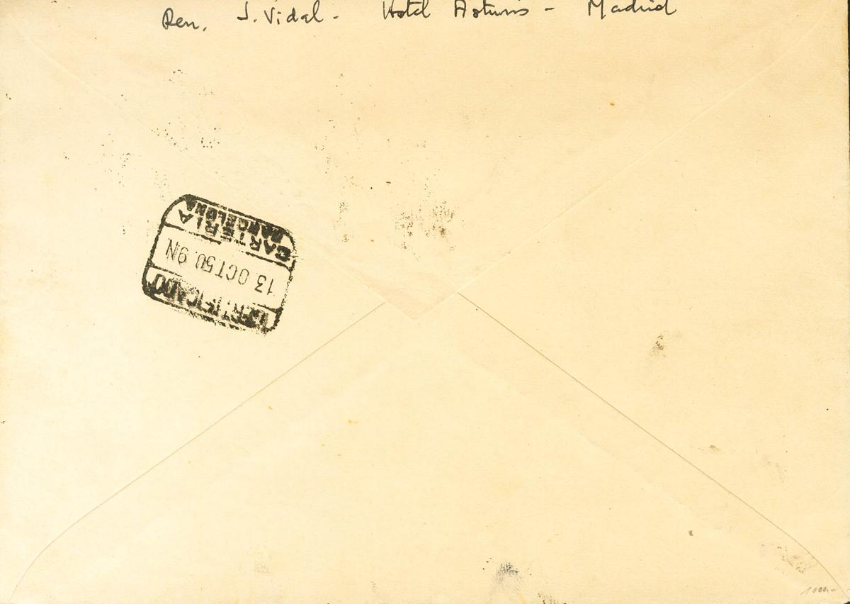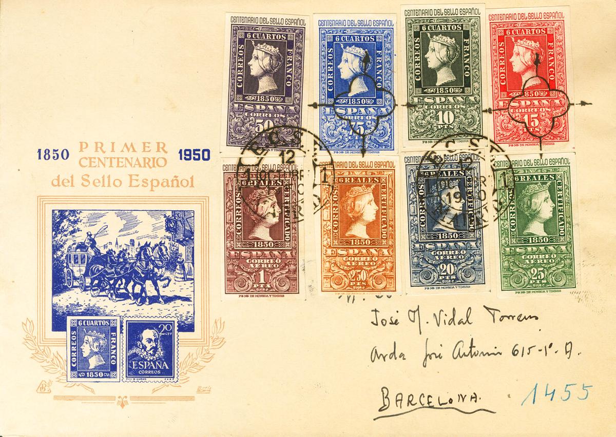 1075/82. 1950. Serie completa. Sobre de Primer Día de MADRID a BARCELONA. Al dorso llegada. MAGNIFICO. Edifil 2023: 875 Euros