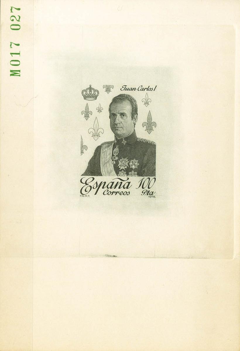 (★) 2505P. 1978. 100 pts gris-negro. PRUEBA DE PUNZON, con numeración en verde, este sello fue grabado por Mansó y es considerado una de las obras cumbres de su trabajo. MAGNIFICA Y UNICA CONOCIDA, SIN DUDA ESTAMOS ANTE UNA DE LAS PIEZAS MAS IMPORTANTES DE LA FILATELIA MODERNA ESPAÑOLA, QUE IMPACTA POR SU BELLEZA E IMPORTANCIA, ADEMAS DE POR SU CALIDAD ARTISTICA Y ELEGANCIA QUE YA NO SE APRECIA EN LOS TRABAJOS FILATELICOS DE LA FNMT.