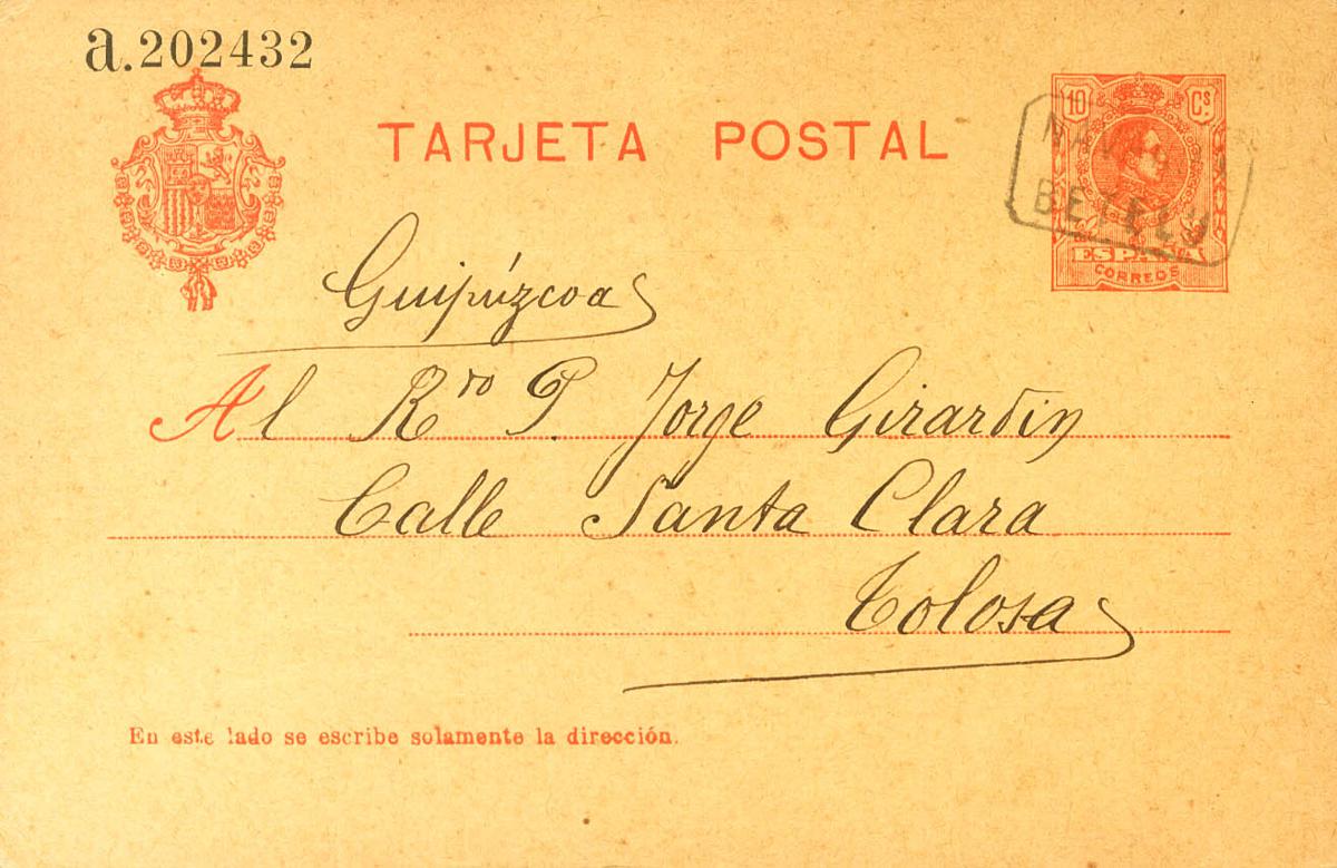 EP49. 1916. 10 cts naranja sobre Tarjeta Entero Postal de BETELU a TOLOSA. Matasello cartería NAVARRA / BETELU, en azul. MAGNIFICA.