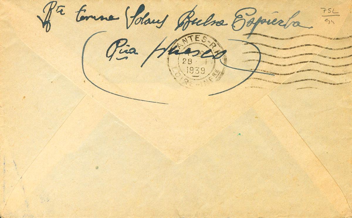 844(2), 817. 1939. 30 cts rojo, dos sellos y 10 cts verde. ESPIERBA (HUESCA) a NANTES (FRANCIA). Matasello GIRO POSTAL / HUESCA / AINSA y en el frente marca CENSURA MILITAR / AINSA, en violeta y al dorso llegada. MAGNIFICA Y MUY RARA, NO RESEÑADA.