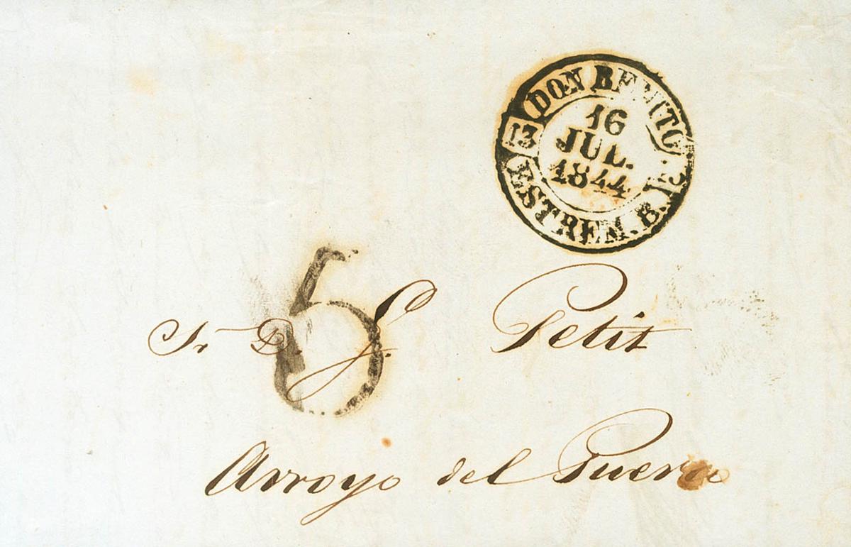 1844. DON BENITO (BADAJOZ) a ARROYO DEL PUERCO. Baeza DON BENITO / ESTREM.B., en negro. MAGNIFICA Y RARA.