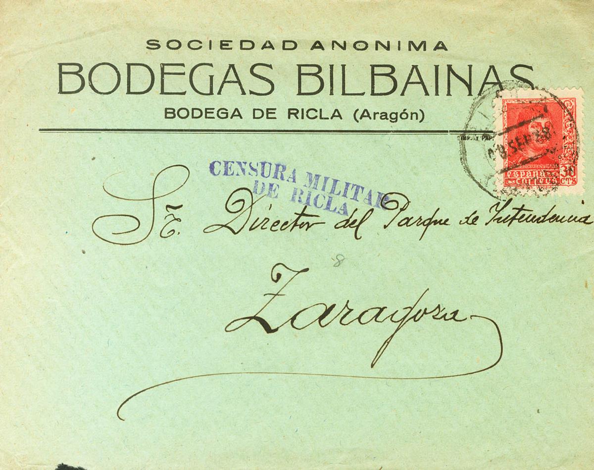 844. 1938. 30 cts rojo. RICLA (ZARAGOZA) a ZARAGOZA. En el frente marca CENSURA MILITAR / DE RICLA, en violeta. MAGNIFICA Y RARA.