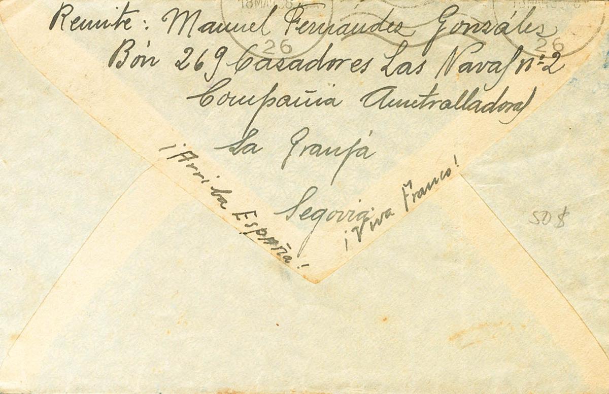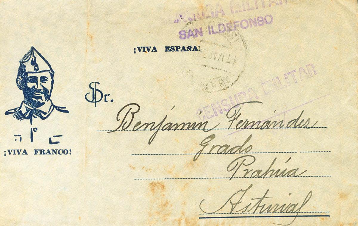 1938. SAN ILDEFONSO (SEGOVIA) a GRADO (ASTURIAS). Marca CENSURA MILITAR / SAN ILDEFONSO, en violeta y al dorso llegada. MAGNIFICA Y RARA.
