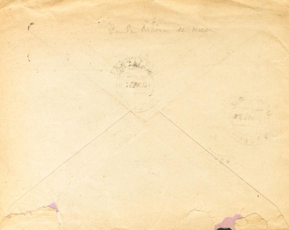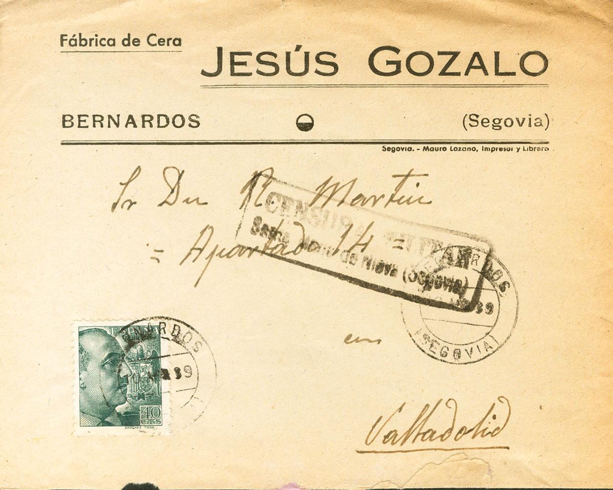 870. 1939. 40 cts verde gris. BERNARDOS (SEGOVIA) a VALLADOLID. En el frente marca CENSURA MILITAR / SANTA MARIA DE NIEVA (SEGOVIA). MAGNIFICA.