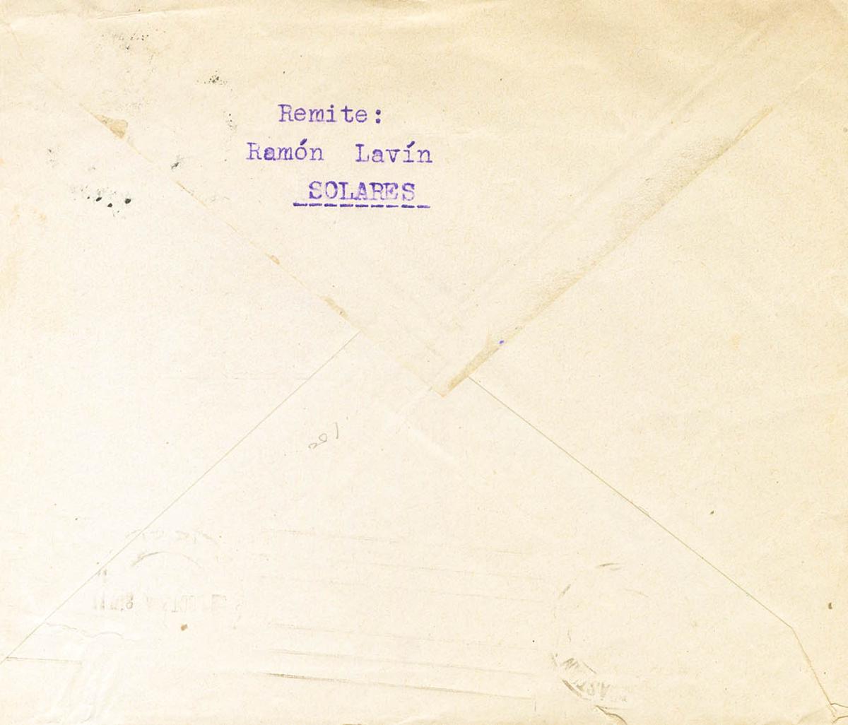 857. 1938. 30 cts rosa. SOLARES (SANTANDER) a SANTANDER. En el frente marca CENSURA MILITAR / SOLARES, en negro. MAGNIFICA Y RARA.