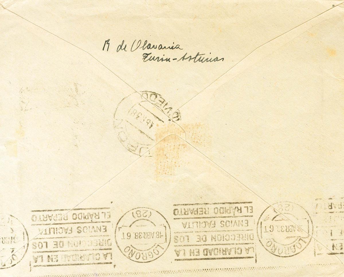 823. 1938. 30 cts rosa. TURON (ASTURIAS) a LOGROÑO. En el frente marca CENSURA / TURON (MIERES) y al dorso llegada. MAGNIFICA.
