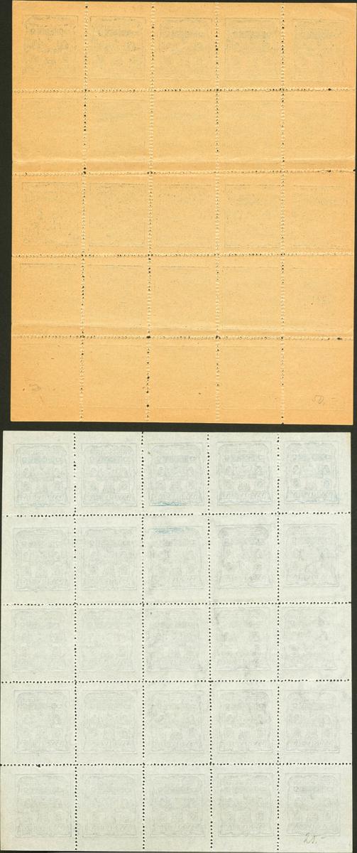 (★)(1937ca). 5 cts azul sobre blanco y 5 cts azul sobre amarillo, en hojas completas de veinticinco sellos. AROCHE (HUELVA). MAGNIFICAS. (Allepuz 1/2, Fesofi 2, 3)