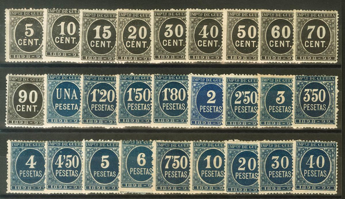★1898. Serie completa, veintisiete valores (incluyendo además la serie de correo de cuatro sellos). IMPUESTO DE GUERRA. MAGNIFICA Y RARA. (Alemany 21/47)