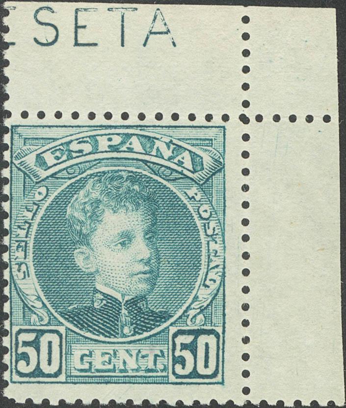 ★★ 252ec. 1901. 50 cts verde, esquina de pliego. ERROR DE COLOR. MAGNIFICO Y RARISIMO. Cert. COMEX. Edifil 2015: +1.975 Euros