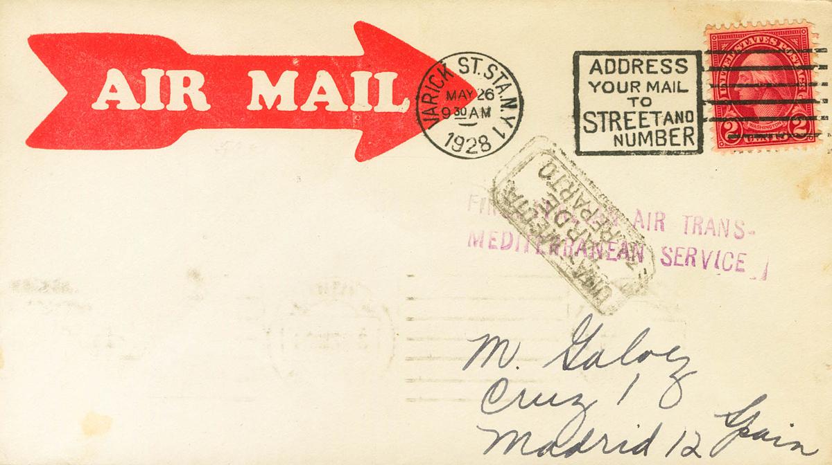 1928. 2 ctvos rojo de Estados Unidos. Correo Aéreo de NUEVA YORK (U.S.A.) a MADRID. En el frente marca FIRST ITALIAN AIR TRANS- / MEDITERRANEAN SERVICE, en violeta, correspondencia recogida del buque "Conte Grande" y transportada por la S.A.N.A. (Societa Anonima Navigazione Aerea) en su primer vuelo experimental Algeciras-Barcelona-Génova, utilizando un hidroavión Dornier Wal, al dorso llegada. MAGNIFICA Y RARA.