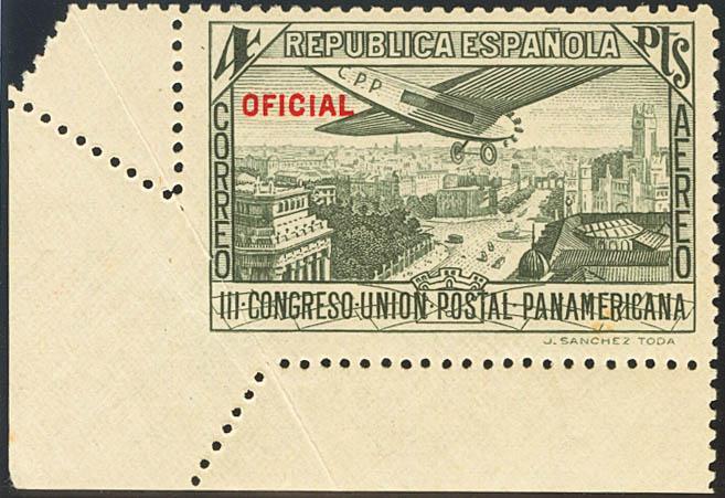 ★★ 635. 1931. 4 pts gris, esquina de pliego. Variedad DENTADO PARCIAL POR PLIEGUE DE PAPEL. MAGNIFICO Y RARISIMO.