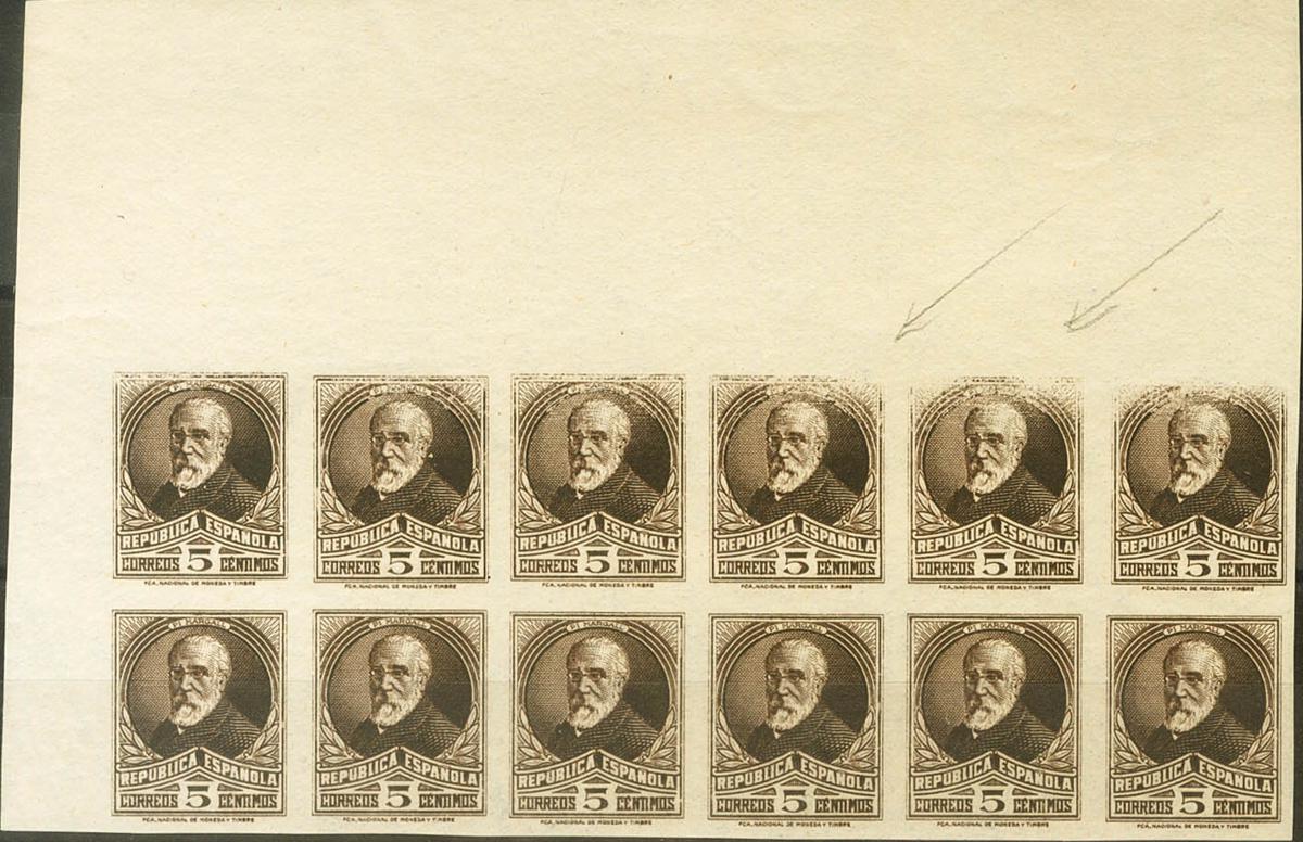 ★★ 662s(12). 1932. 5 cts castaño negro, bloque de doce, esquina de pliego. Sellos superiores VARIEDAD IMPRESION DILUIDA (sin dentar). MAGNIFICO. Edifil 2023: ++348 Euros