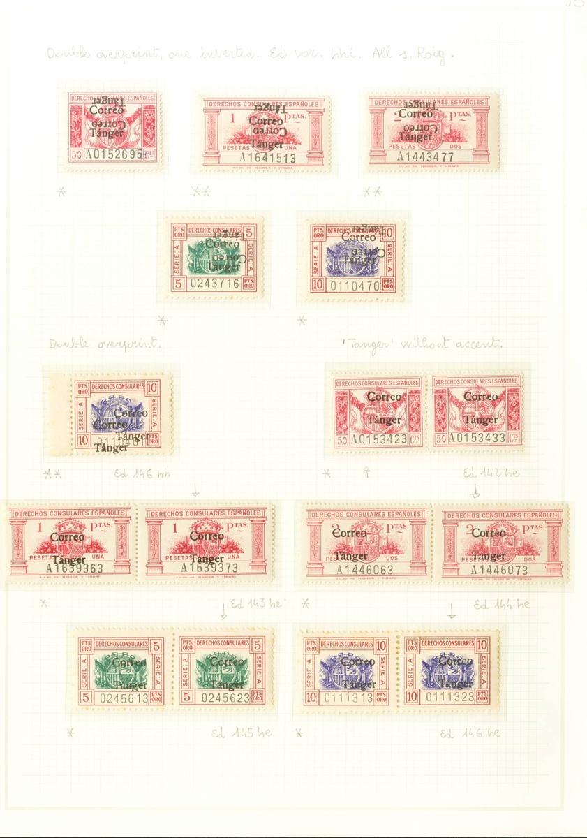 ★★/★1938. Interesante conjunto de la emisión de Derechos Consulares de 1938, la mayoría en nuevo y sin fijasellos, incluye una serie completa normal, dos series completas en pareja, un sello variedad Tanger sin acento, una serie con sobrecarga doble, una invertida, así como otras variedades (buena calidad en general). A EXAMINAR.