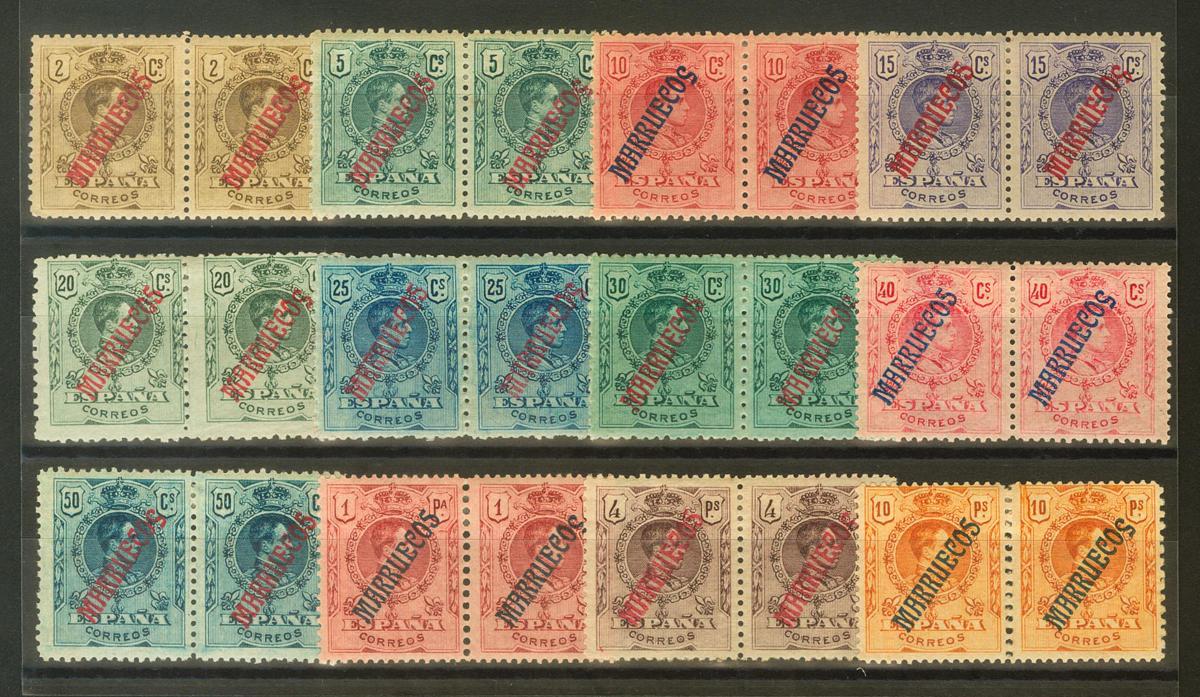 30/41, 30/41he. 1914. Serie completa, en parejas (a falta del 4/4 cts y 20 cts urgente). Un sello variedad "S" DE MARRUECOS INVERTIDA. MAGNIFICA Y RARISIMA. Edifil 2018: 1.016 Euros