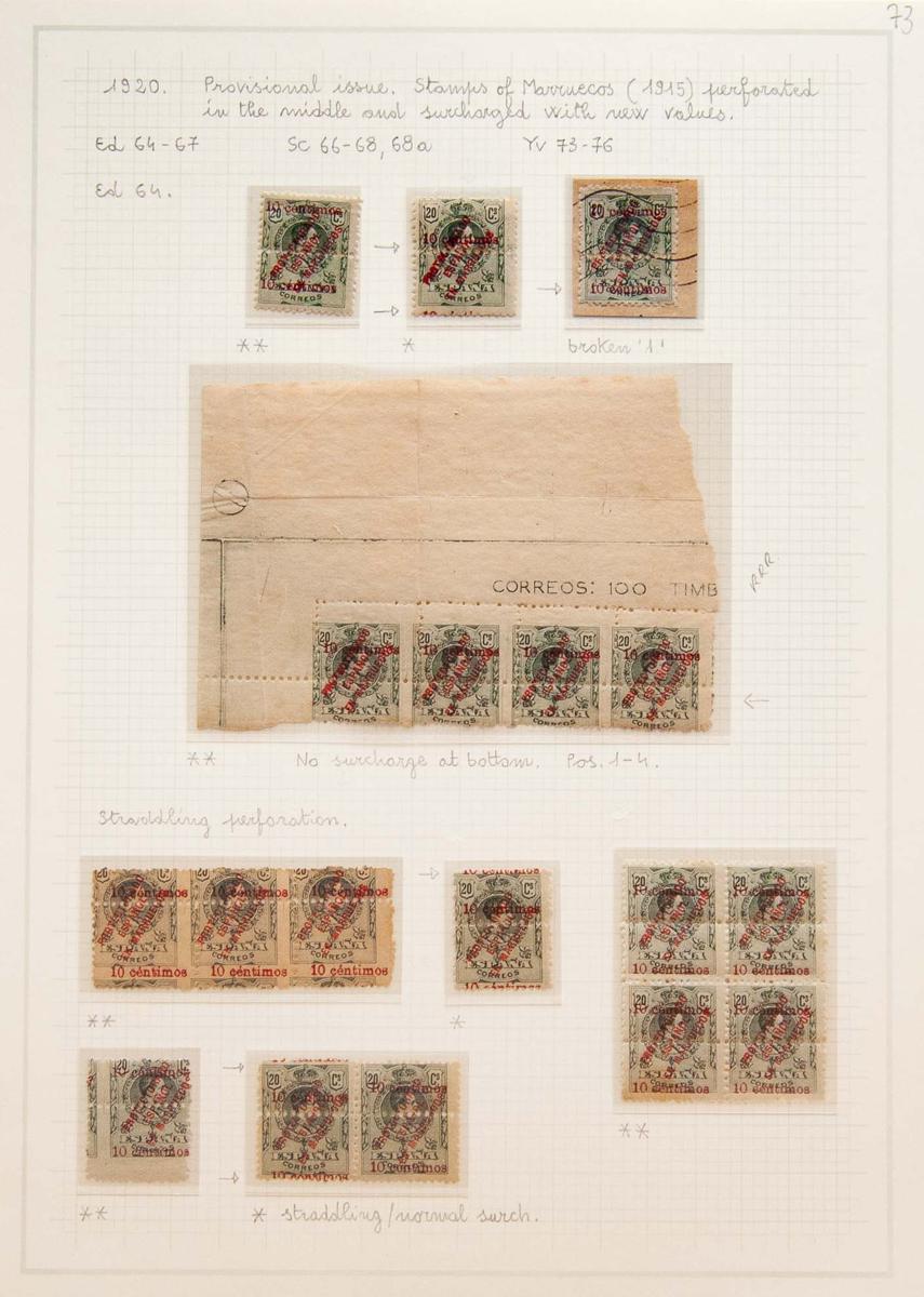 ★/ 64/67. 1920. Espectacular conjunto de la emisión sobrecargada de Marruecos de 1920, muy bien representada en cada sello con numerosas variedades de sobrecarga, la mayoría reseñadas en el catálogo y alguna muy rara (sobrecargas dobles, invertidas, variantes diversas como CENTIWOS, CENTLMOS, etc), además de alguna carta y bloques de varios tamaños. MERECE UN DETENIDO EXAMEN POR SU ALTA ESPECIALIZACION Y RAREZA. IMPRESCINDIBLE EXAMINAR. Edifil 2018: +10.000 Euros
