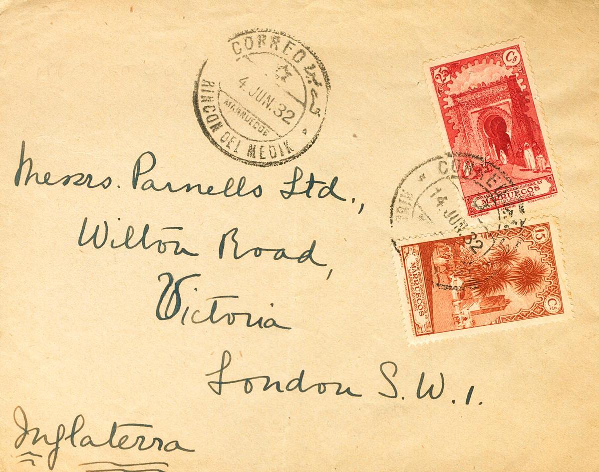 109, 111. 1932. 15 cts castaño amarillo y 25 cts rojo. RINCON DEL MEDIK a LONDRES (GRAN BRETAÑA). Matasello bilingüe CORREO / RINCON DEL MEDIK. MAGNIFICA.