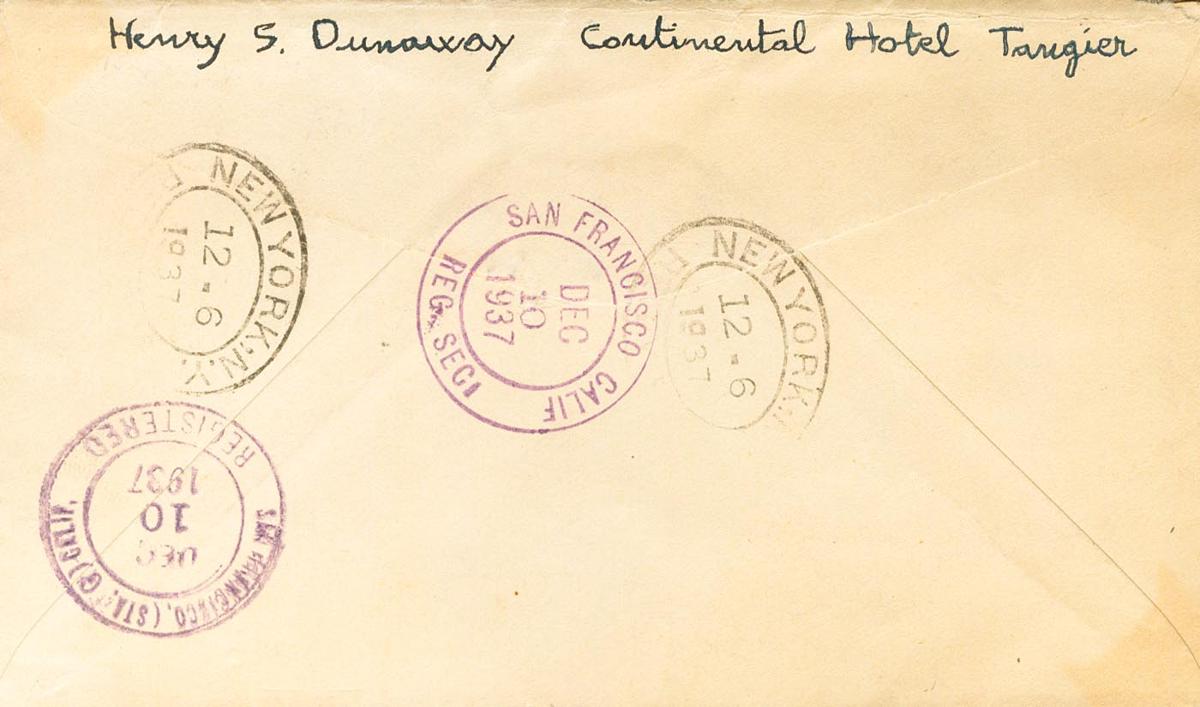 150, 151(2), 152, 155. 1937. 5 cts naranja, 15 cts violeta, dos sellos, 25 cts violeta, 40 cts naranja y 10 cts de Beneficencia. TETUAN a SAN FRANCISCO (U.S.A.). Al dorso llegada. MAGNIFICA.