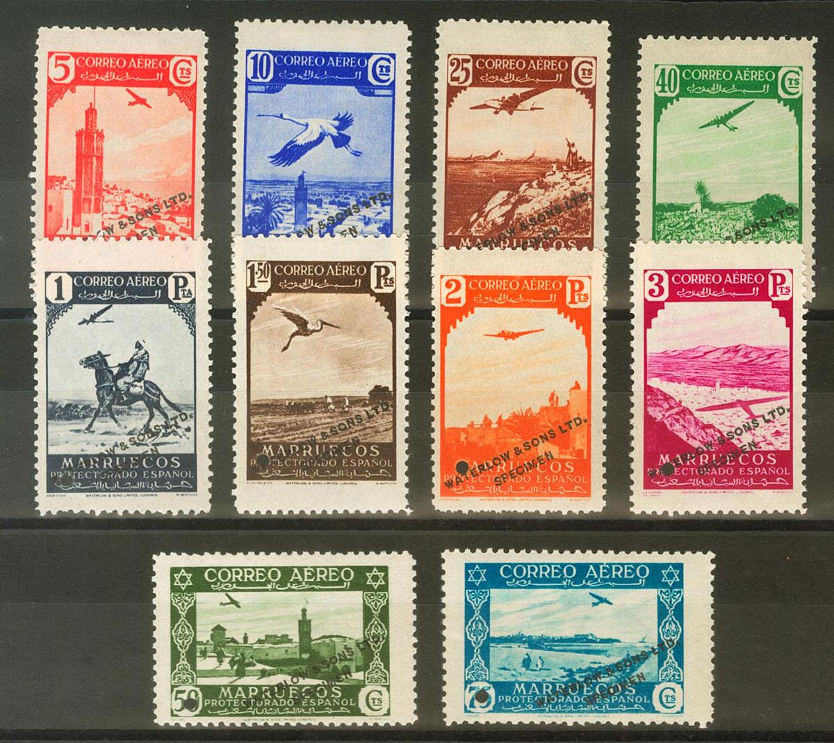 ★ 186/95M. 1938. Serie completa. CAMBIOS DE COLOR con sobrecarga WATERLOW AND SONS LTD / SPECIMEN y taladro. MAGNIFICA Y RARA. Edifil 2018: 900 Euros