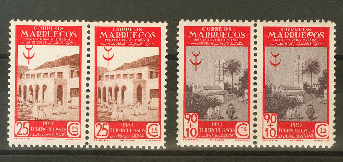 ★★ 271it, 274it. 1946. 25 cts rojo y sepia y 90 cts+10 cts carmín y gris, parejas. Ambas parejas un sello variedad MANCHA EN LA "C" DE MARRUECOS. MAGNIFICOS. Edifil 2018: +30 Euros