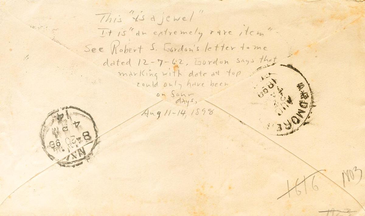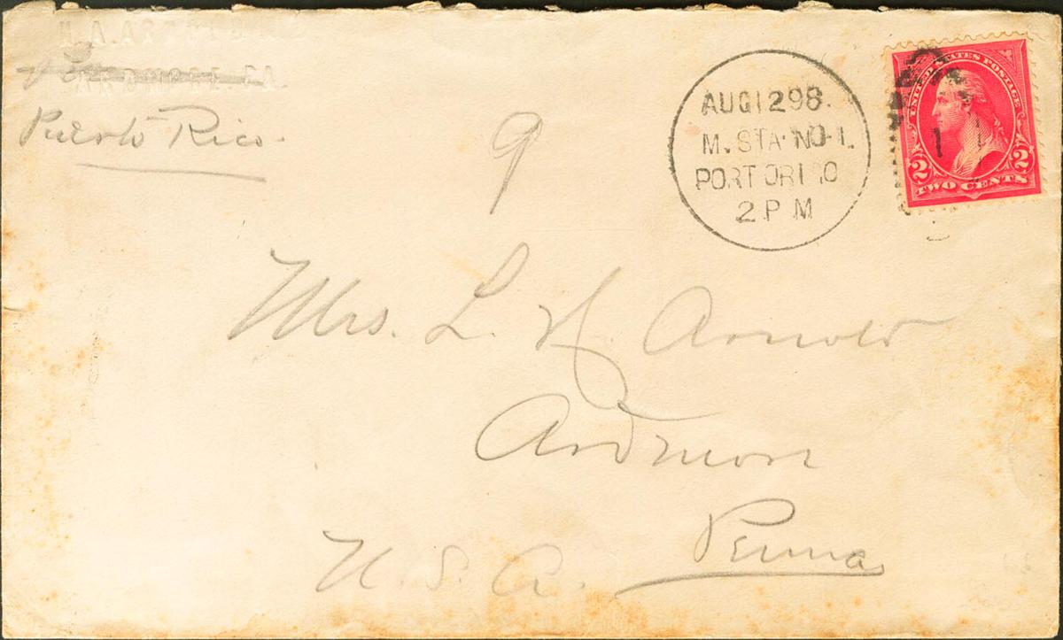 1898. 2 ctvos rosa de Estados Unidos. PUERTO RICO a ARDMORE (U.S.A.). Matasello dúplex M.STA.Nº1 / PORTO RICO / 1, al dorso llegada. MAGNIFICA Y RARA.