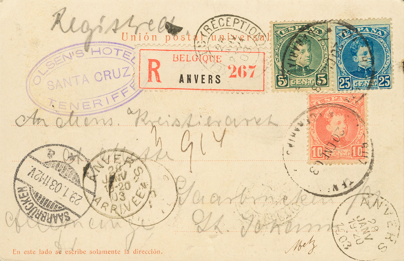 242, 243, 248. 1903. 5 cts verde, 10 cts rojo y 25 cts azul. Tarjeta Postal de SANTA CRUZ DE TENERIFE a SAARBRÜCKEN (ALEMANIA). Certificada a su tránsito por AMBERES (BELGICA), y llegada en el frente. MAGNIFICA Y MUY RARO CERTIFICADO EN TRANSITO SIN APLICACION DEL FRANQUEO CORRESPONDIENTE.