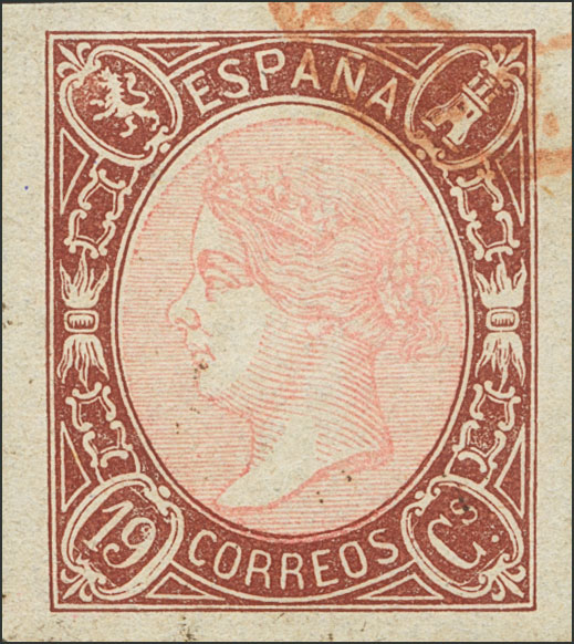 71. 1865. 19 cuartos castaño y rosa (enormes márgenes y color intenso). Matasello limpio y nítido. PIEZA DE LUJO, PROBABLEMENTE SEA EL SELLO USADO MAS BONITO DE TODOS LOS CONOCIDOS. Cert. GRAUS. Edifil 2019: 1.000 Euros