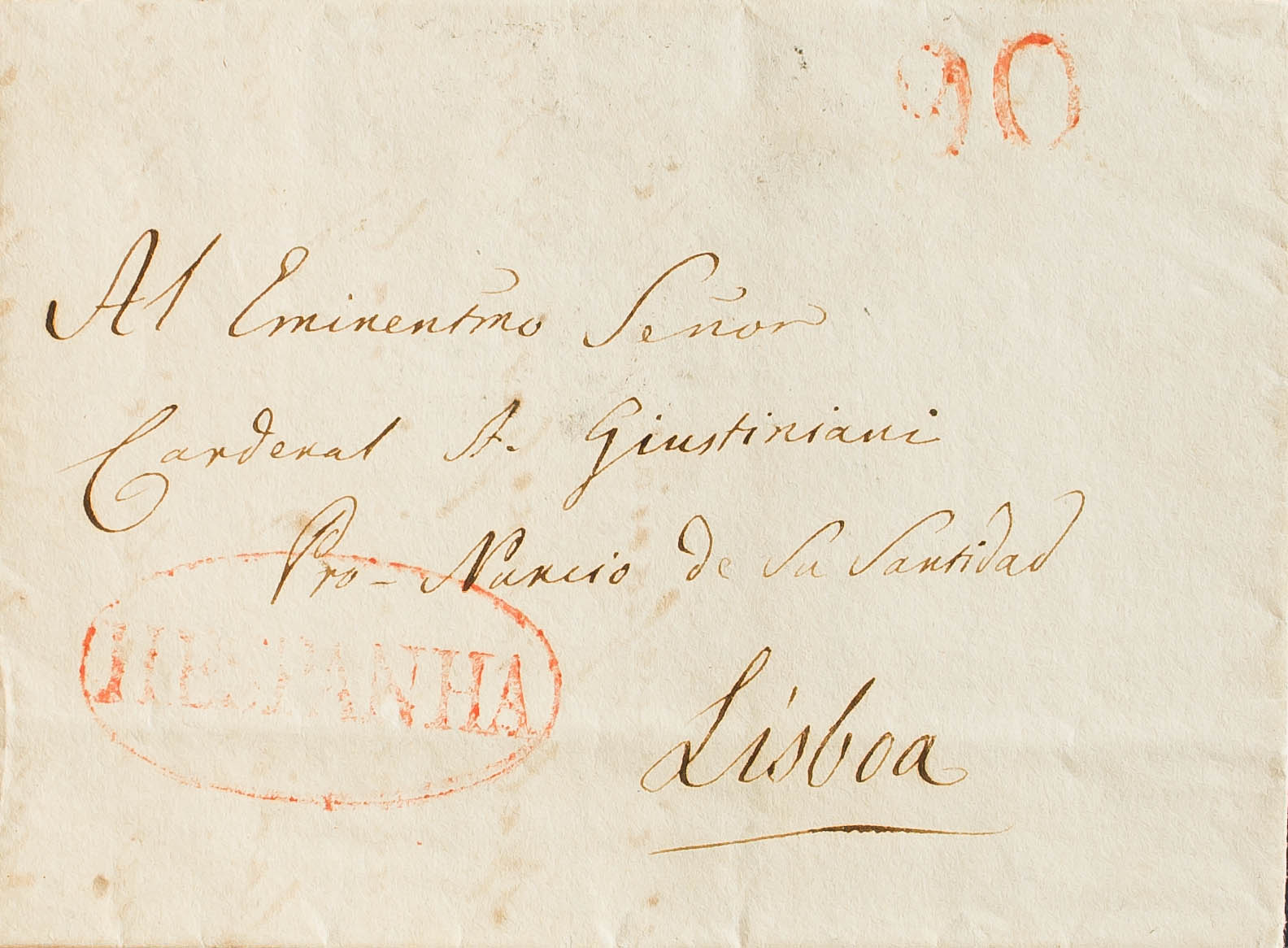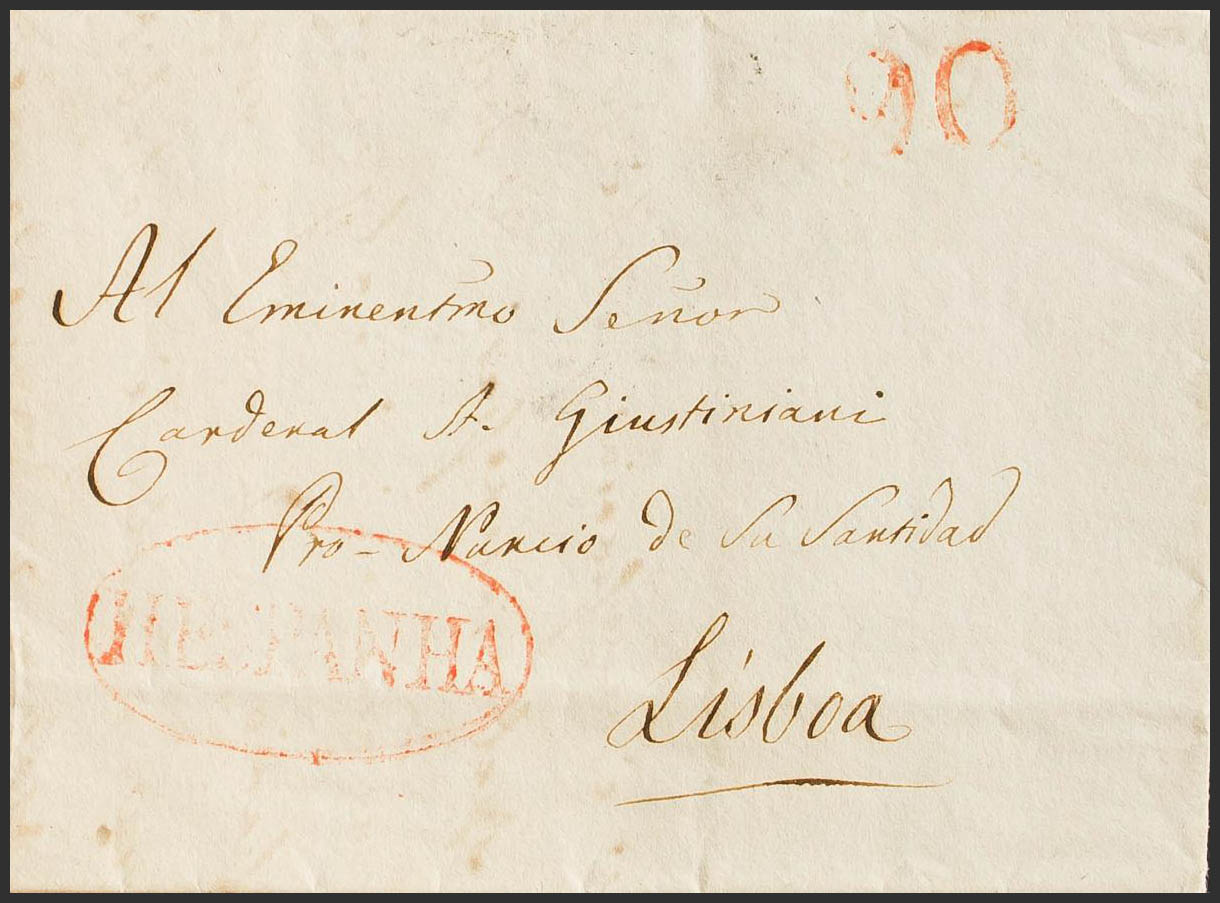 1833. MADRID a LISBOA. Circulada sin marcas hasta la llegada donde se aplica la marca HESPANHA, en rojo (LSBOE3) y porteo Ê90" (reis). MAGNIFICA Y RARA.