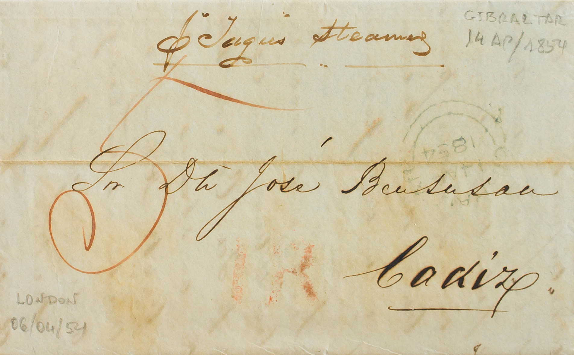 1854. LONDRES a CADIZ (ESPAÑA). En el frente fechador GIBRALTAR (tipo grande), en azul aplicado en tránsito y porteo británico "5" y español "1" (real), manuscrito "Per Tagus Steamer". MAGNIFICA.