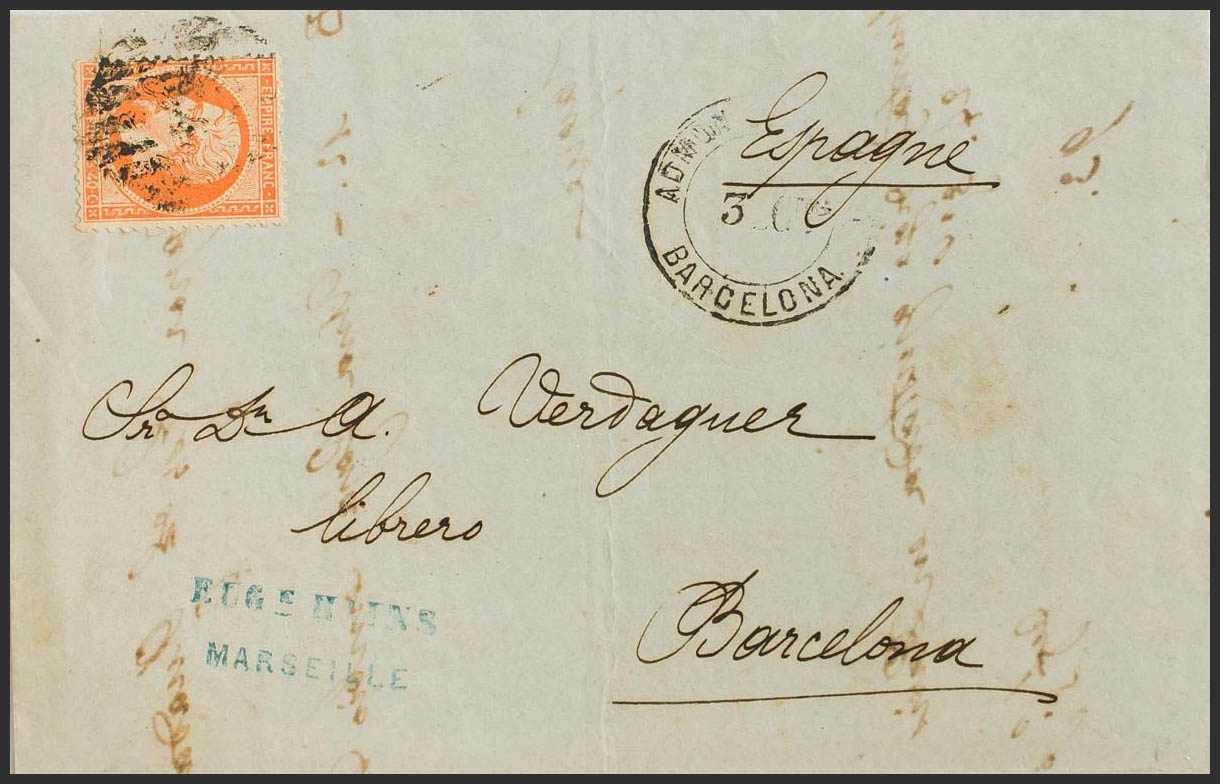 Yvert 23. 1865. 40 cts naranja. MARSELLA a BARCELONA. Matasello PARRILLA Nº2, aplicado a la llegada y en el frente fechador ADMON DE CAMBIO / BARCELONA. MAGNIFICA.