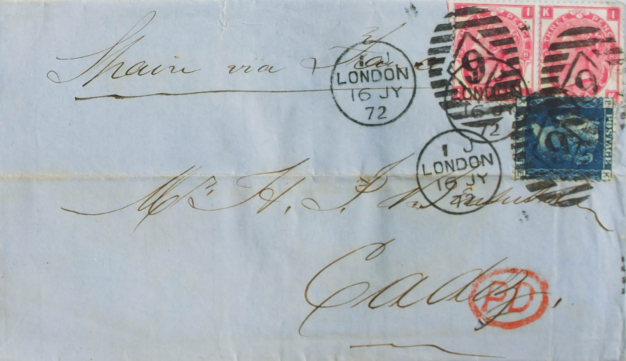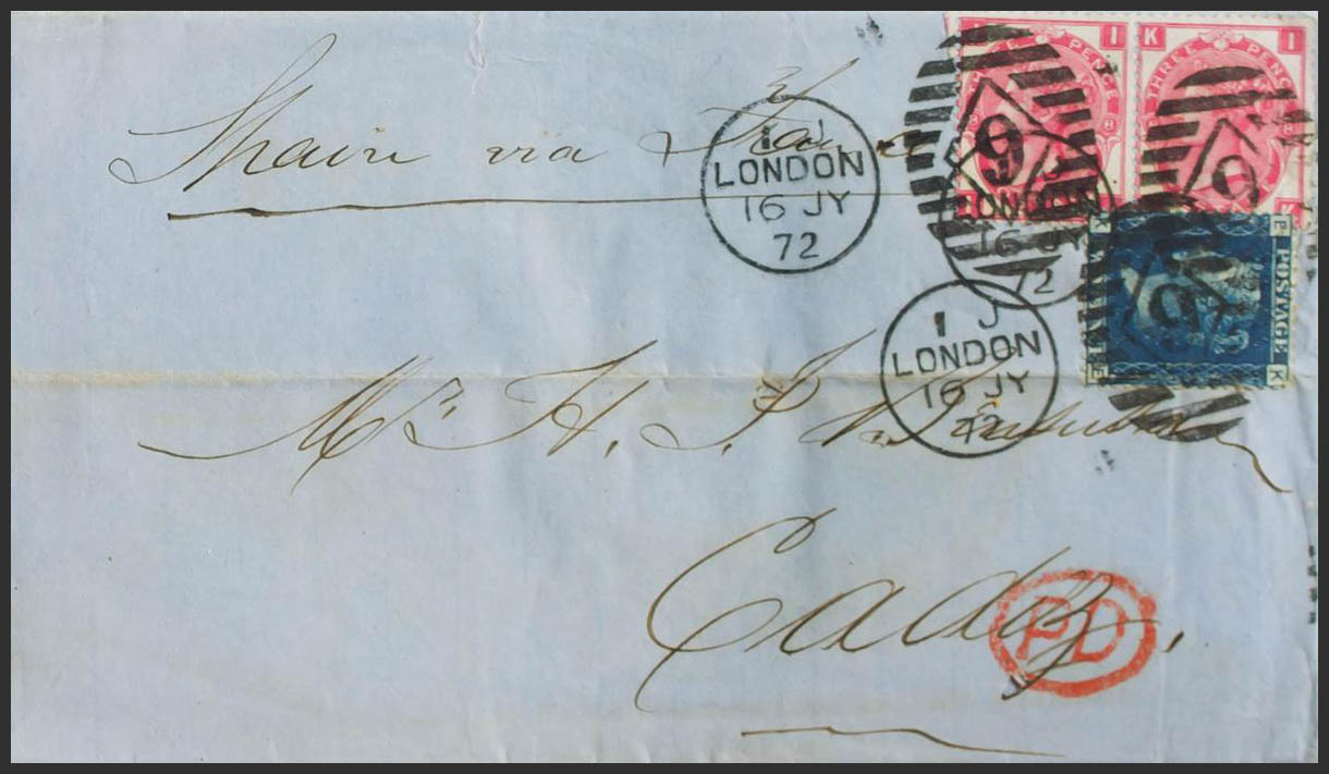 Yvert 27, 33(2). 1872. 2 p azul (doblez de archivo) y 3 p rosa Plancha 8, dos sellos. LONDRES a CADIZ. Matasello dúplex LONDON / 9. BONITA.