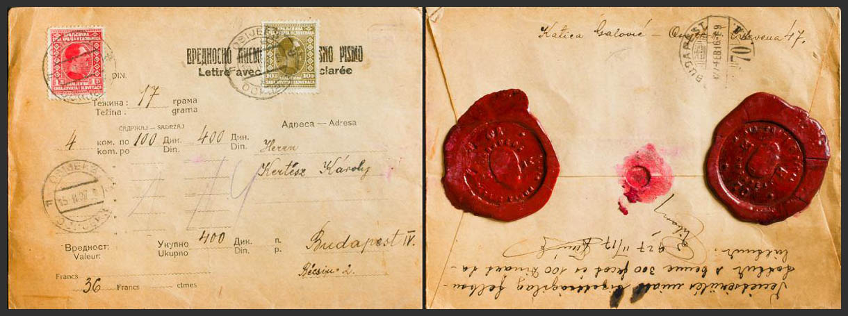 Yvert 172, 178. 1927. 1 d rojo y 10 d oliva. Valor Declarado de OSIJEK a BUDAPEST (HUNGRIA). Al dorso llegada. MAGNIFICA.