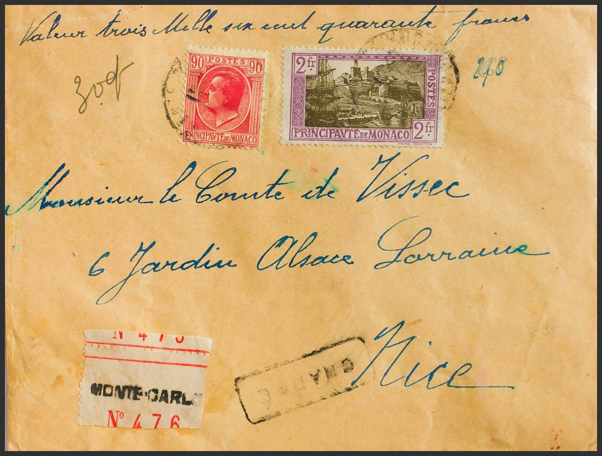 Yvert 94, 100. 1897. 90 cts rosa y 2 fr lila rosa y castaño. Valor Declarado de MONTE CARLO a NIZA. MAGNIFICA.
