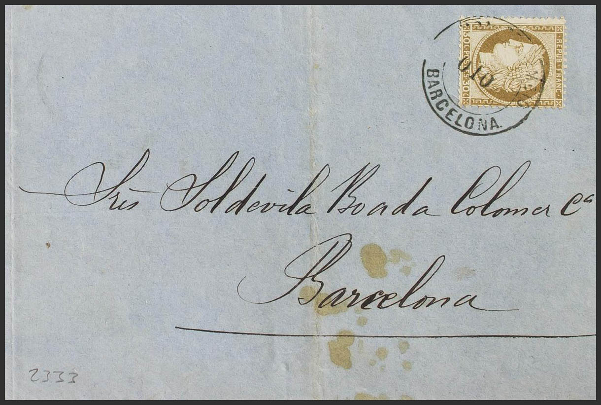 Yvert 56. 1876. 30 cts castaño. MARSELLA a BARCELONA. Matasello ADMON. DE CAMBIO / 0,10 / BARCELONA, aplicado a la llegada. MAGNIFICA Y RARO MATASELLO SOBRE EL VALOR DE 30 CTS.