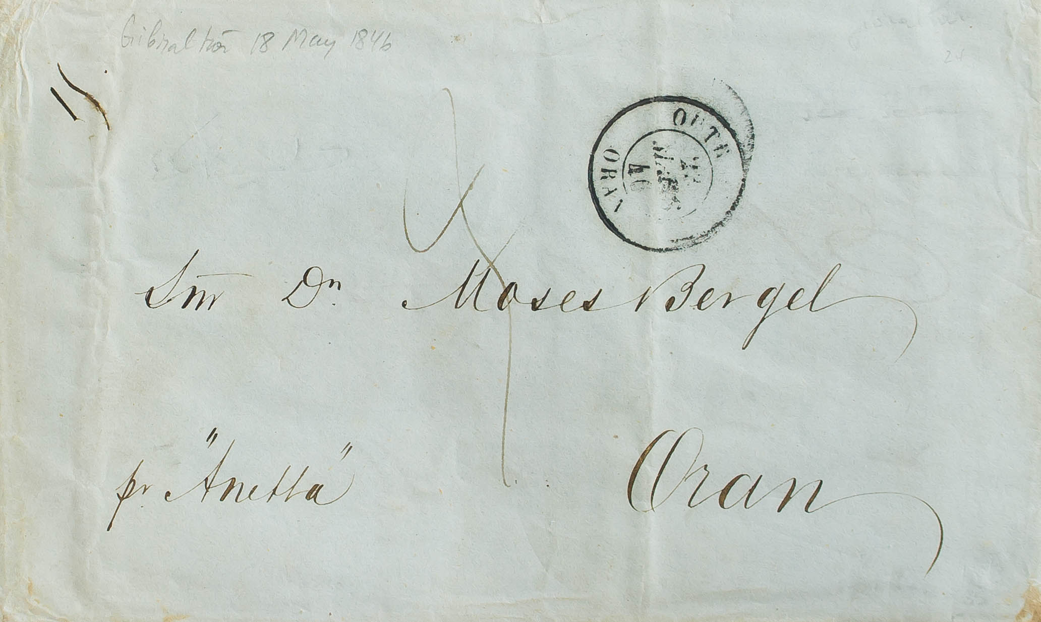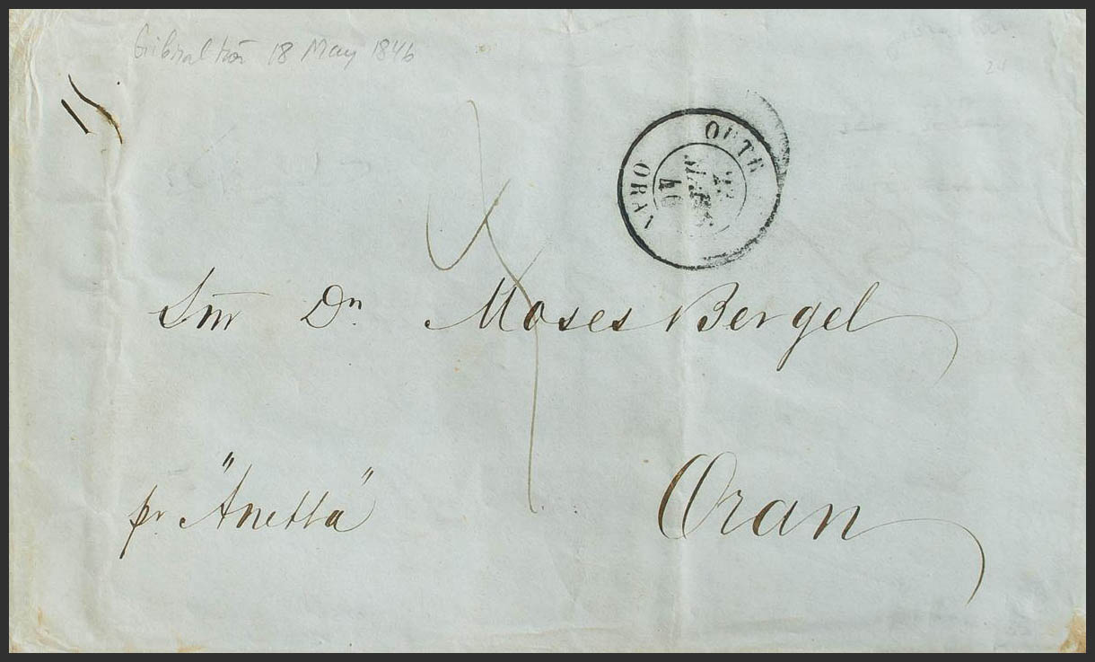 1846. GIBRALTAR a ORAN. Fechador francés OUTREMER / ORAN y porteo "3" manuscrito. MAGNIFICA.