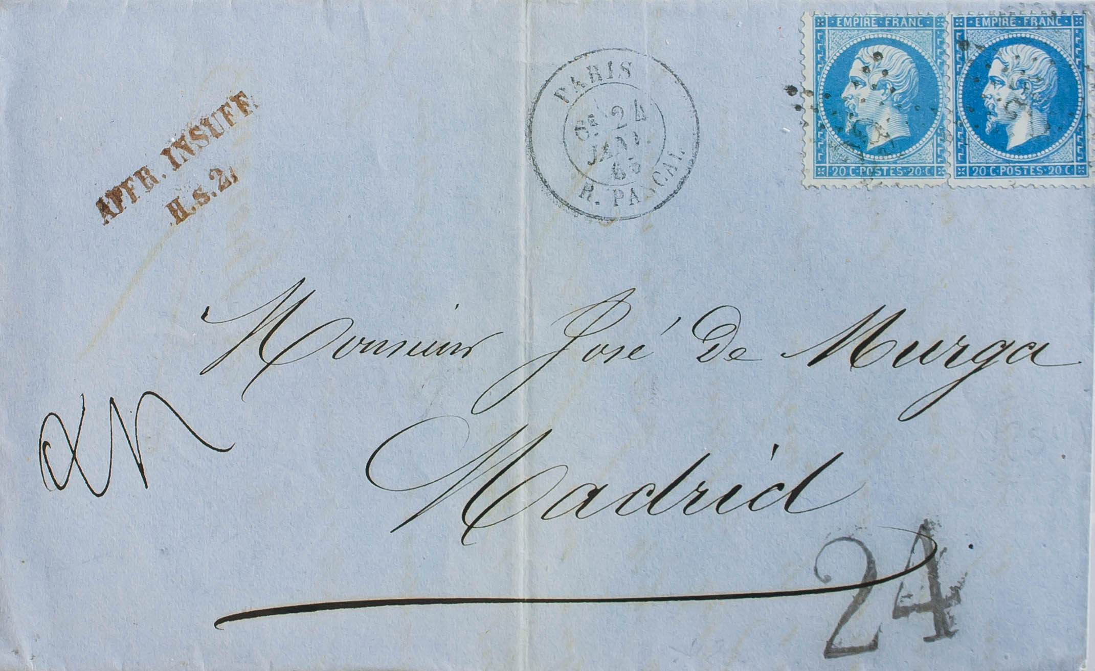 Yvert 22(2). 1865. 20 cts azul, dos sellos con diferentes tonalidades. PARIS a MADRID. Matasello ESTRELLA DE PUNTOS Nº29, en el frente marca AFFR. INSUFF. / H.S.2., en rojo y porteo "24" (cuartos), aplicado a la llegada a España. MAGNIFICA.