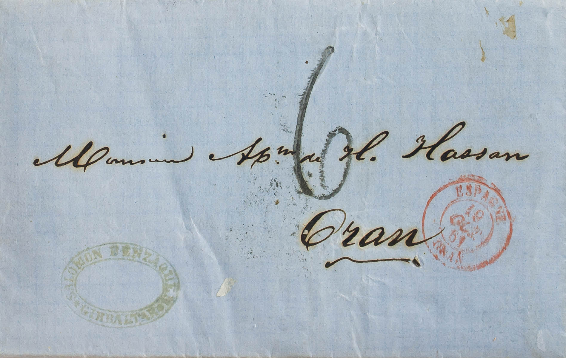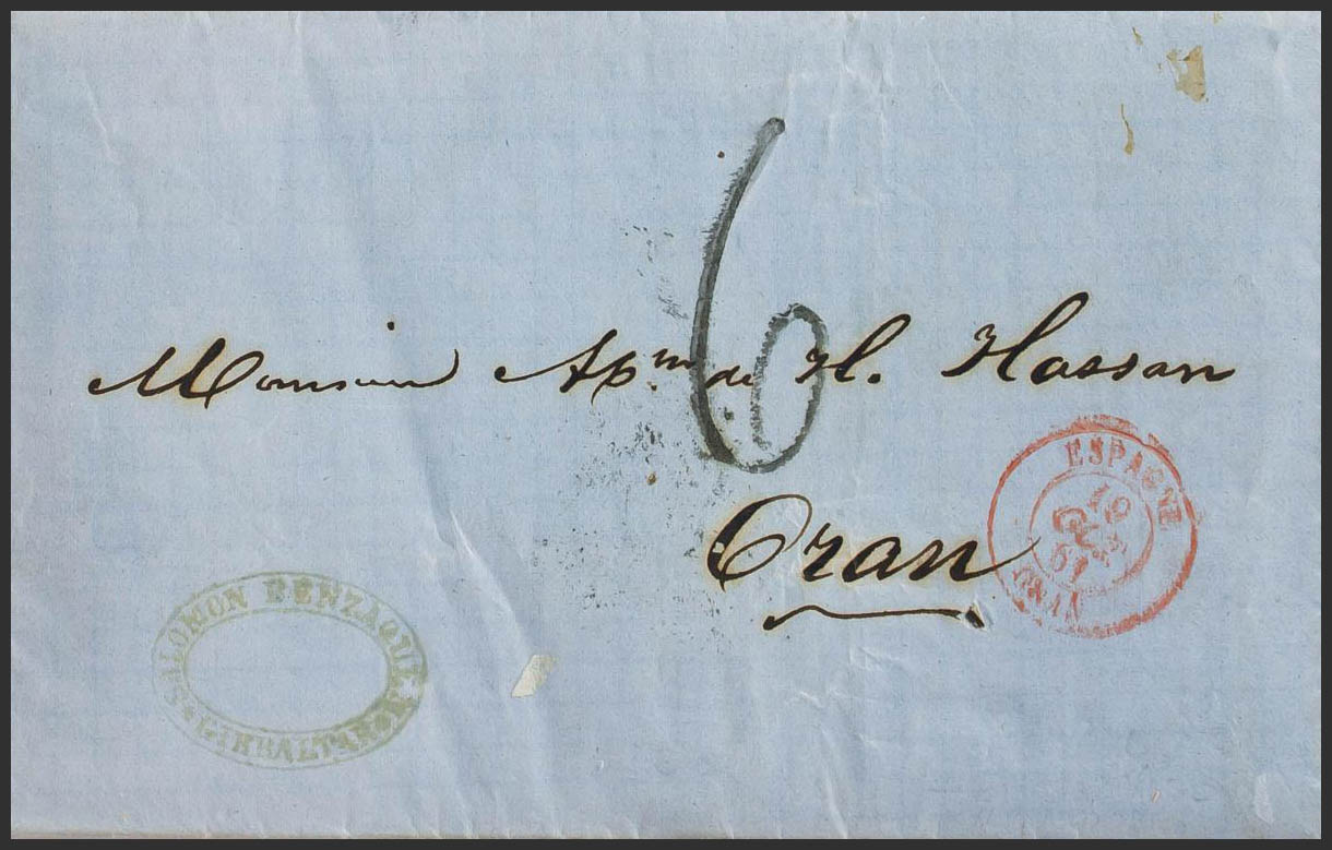 1861. GIBRALTAR a ORAN, circulada por el correo español. Fechador francés de entrada ESPAGNE / ORAN, en rojo y porteo "6" manuscrito. MAGNIFICA Y RARA.