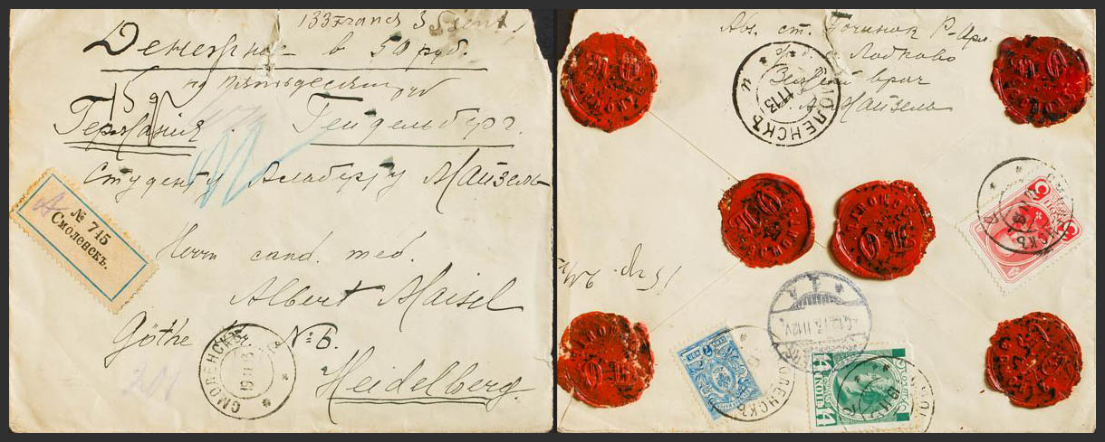 Yvert 66, 78, 82. 1913. 7 k azul, 3 k rosa y 14 k verde, franqueados al dorso. Valor Declarado de SMOLENSK a HEIDELBERG (ALEMANIA). Al dorso llegada. MAGNIFICA.