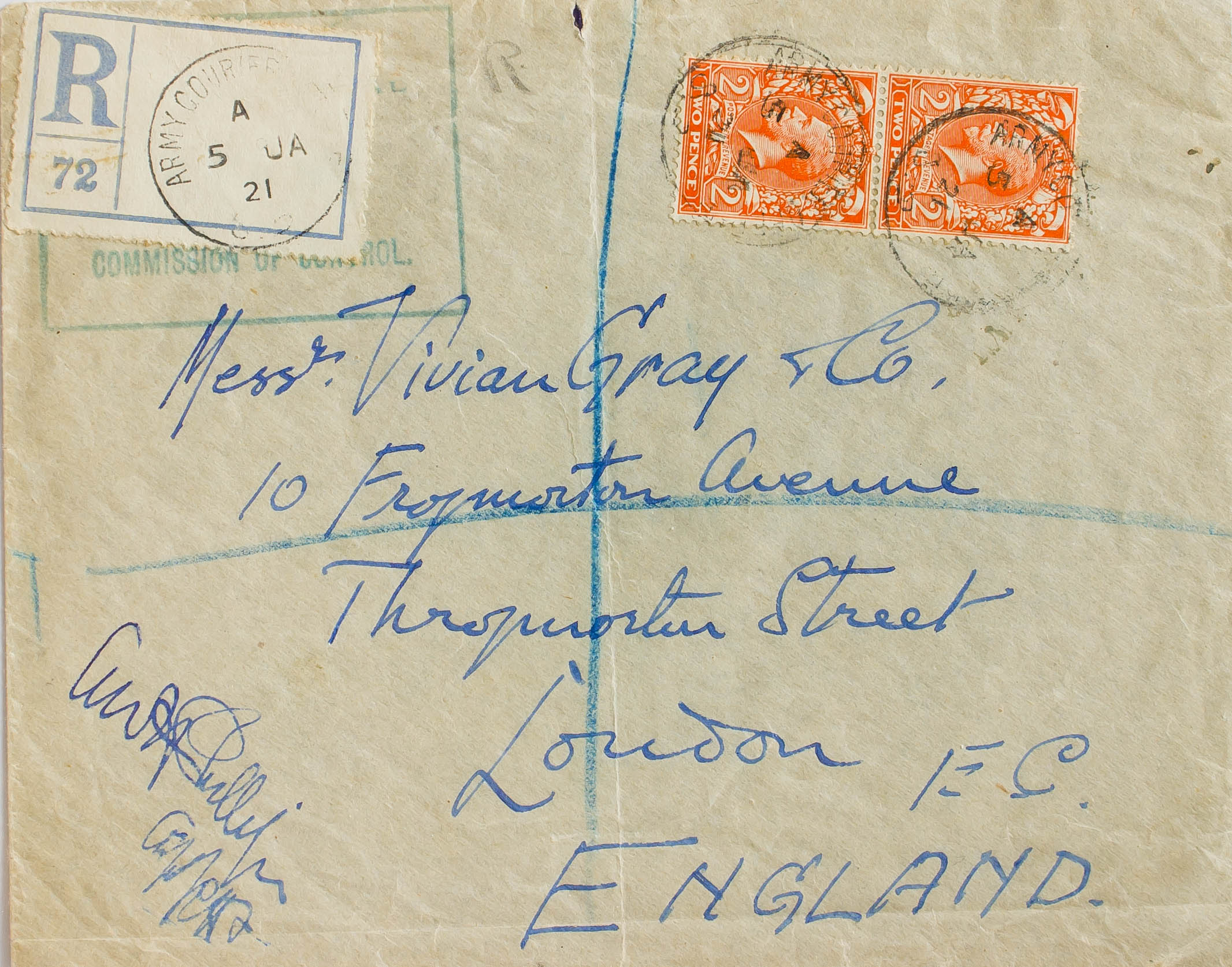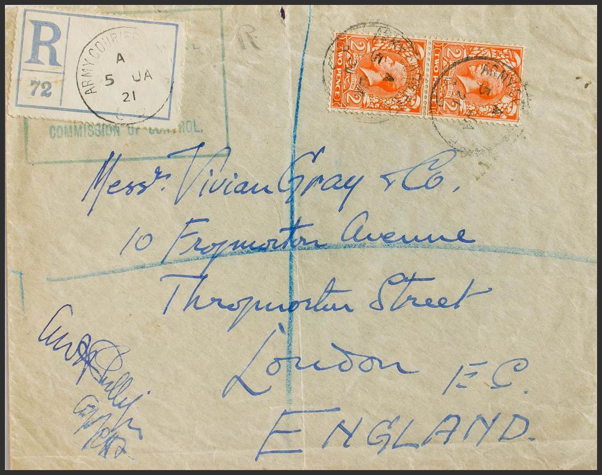Yvert 142(2). 1921. 2 p naranja, pareja. Certificado dirigido a LONDRES. Matasello ARMY COURIER OFFICE, al dorso marca INTERALLIED / AERONAUTICAL / COMMISSION OF CONTROL, en azul y llegada. MAGNIFICA Y RARA.