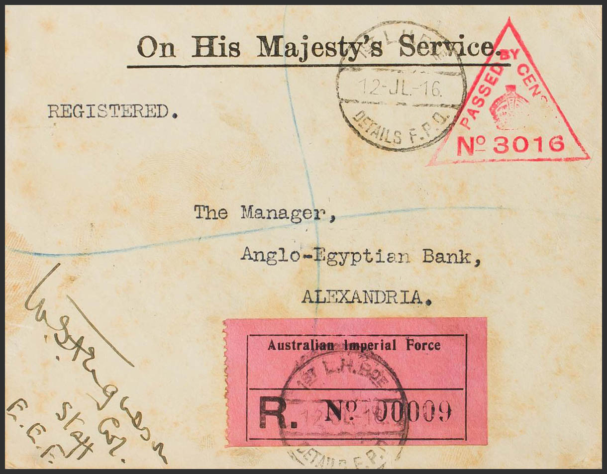 1916. Certificado dirigido a ALEJANDRIA (EGIPTO), remitido por un coronel de la Fuerza Expedicionaria Egipcia. Matasello 1 ST.L.H.BDE. / DETAILS F.P.O., de la 1ª Brigada Australiana de Caballería Ligera y etiqueta de certificado AUSTRALIAN IMPERIAL FORCE, al dorso tránsitos y llegada. MAGNIFICA Y RARA.