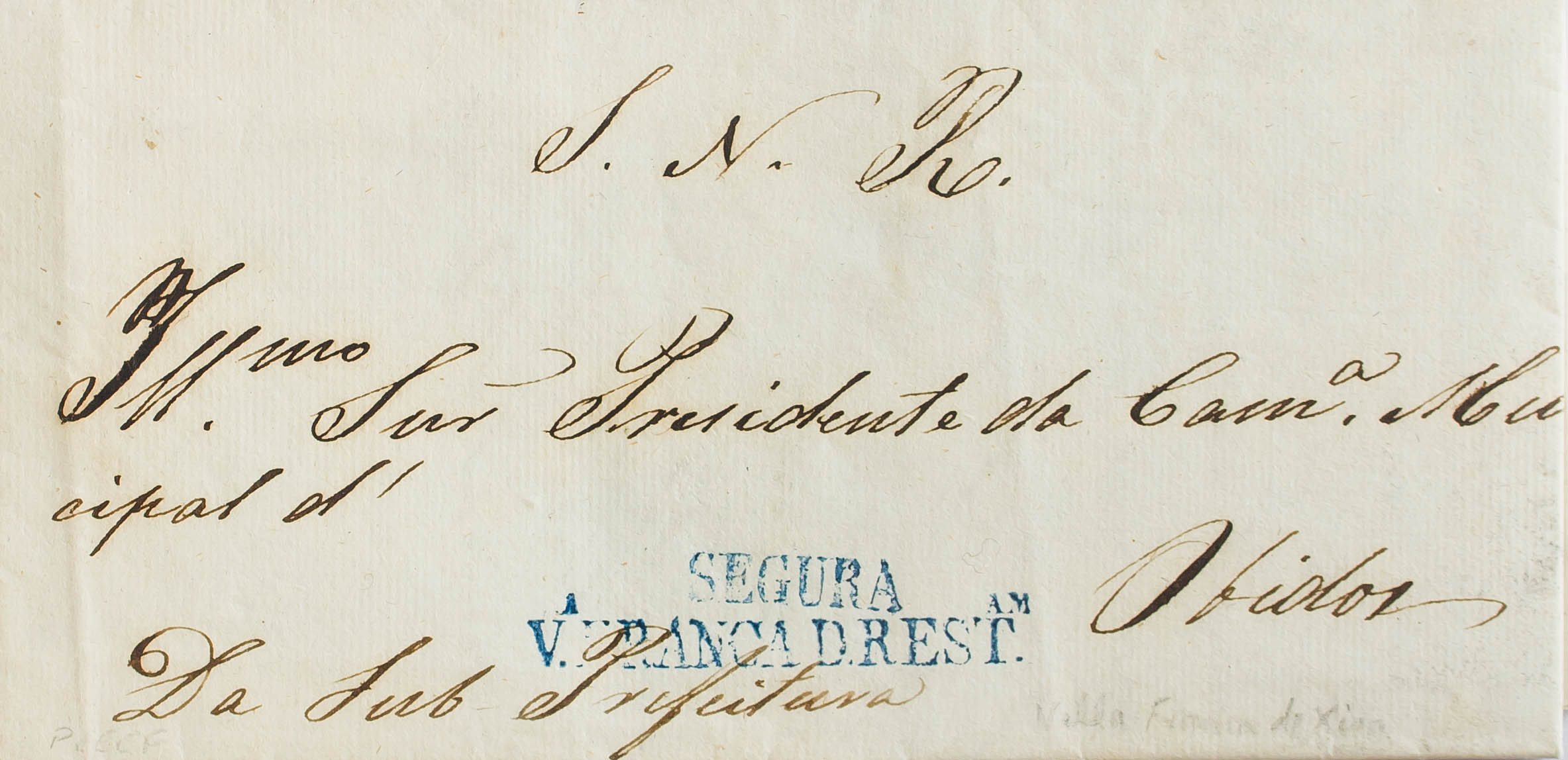 1835. Certificado de VILA FRANCA DE XIRA a OBIDOS. Marcas Vª. FRANCA D. RESTAM. y SEGURA, en azul (VFX 4, VFX-S2). MAGNIFICA Y RARISIMA.
