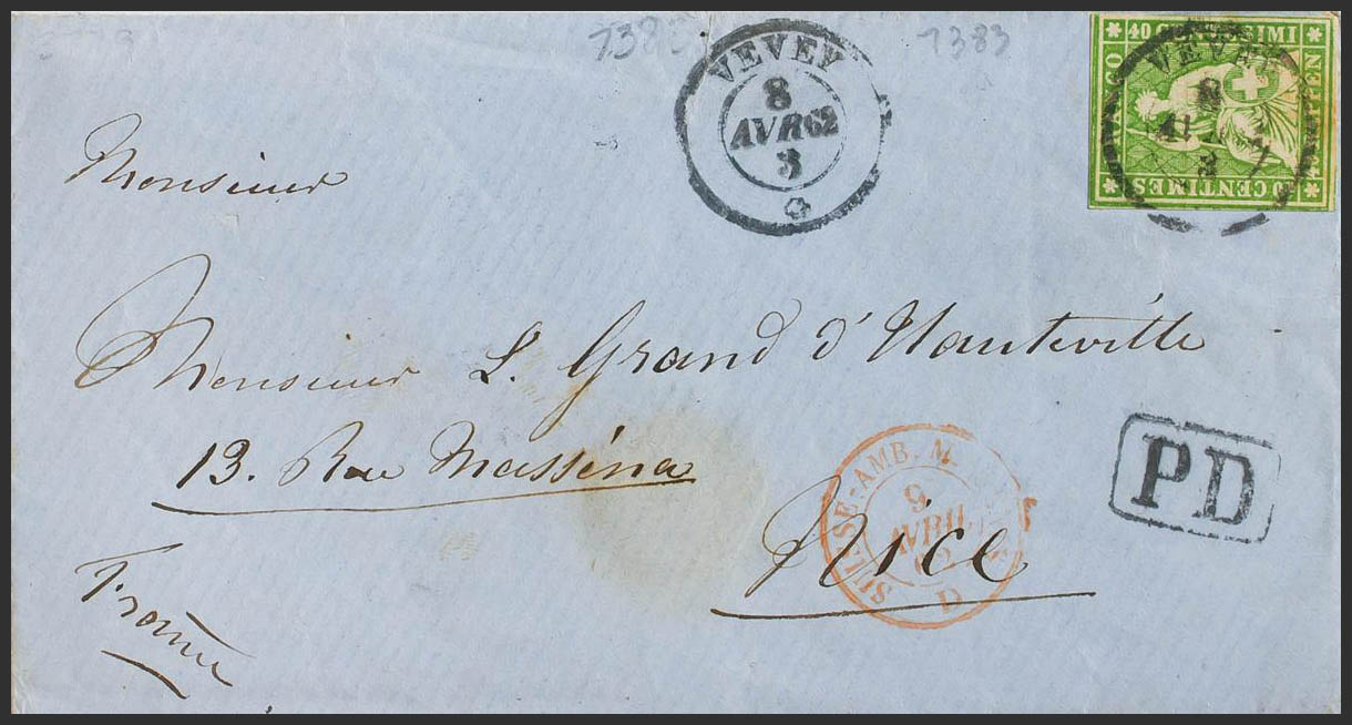 Yvert 30. 1862. 40 rp verde. VEVEY a NIZA. Matasello VEVEY / +. MAGNIFICA.
