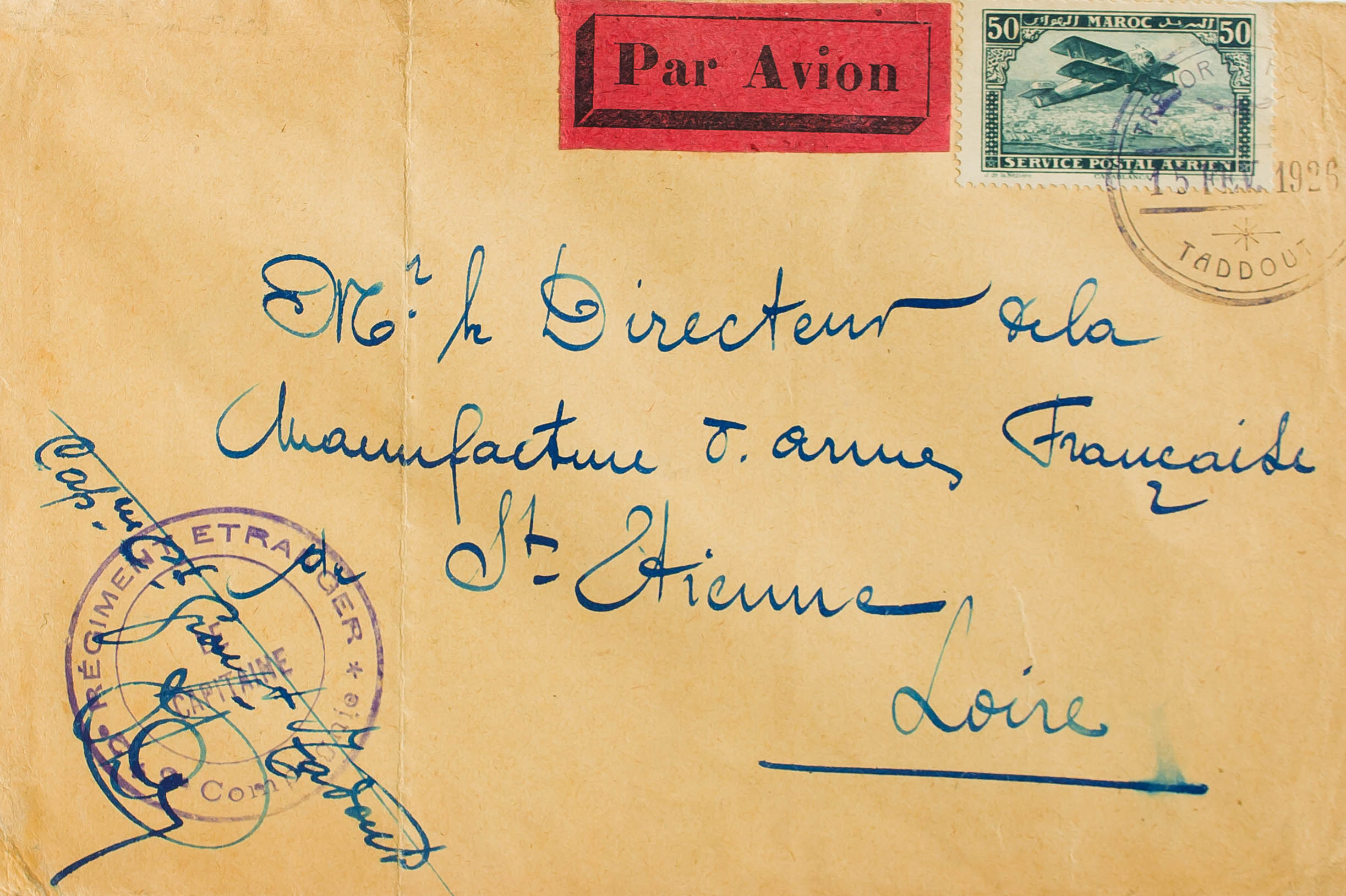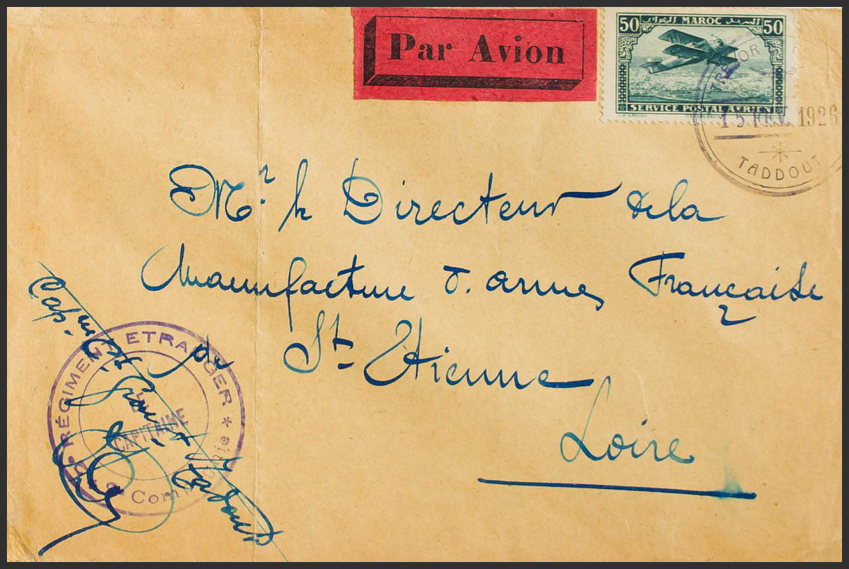 Yvert 3. 1926. 50 cts azul verde. Correo Aéreo de TADOUT a SAINTE ETIENNE. Matasello especial de TADDOUT y en el frente marca 2º REGIMENT ETRANGER / LE CAPITAINE / 2ª COMPAGNIE, en violeta. MAGNIFICA Y RARA.