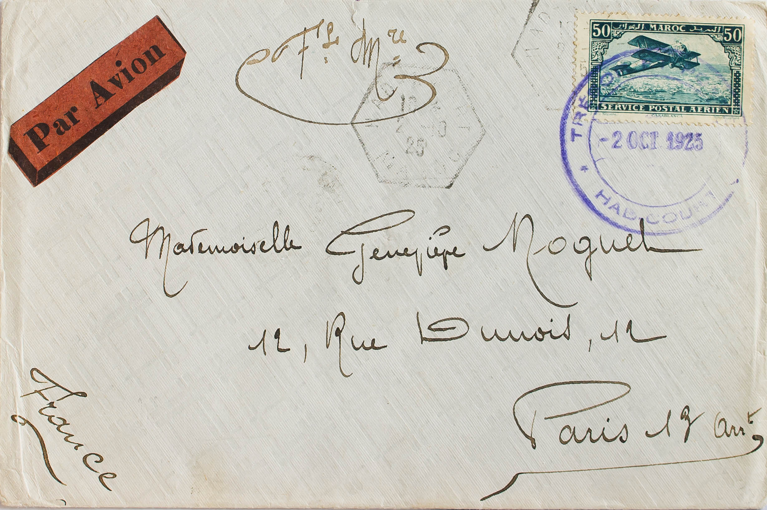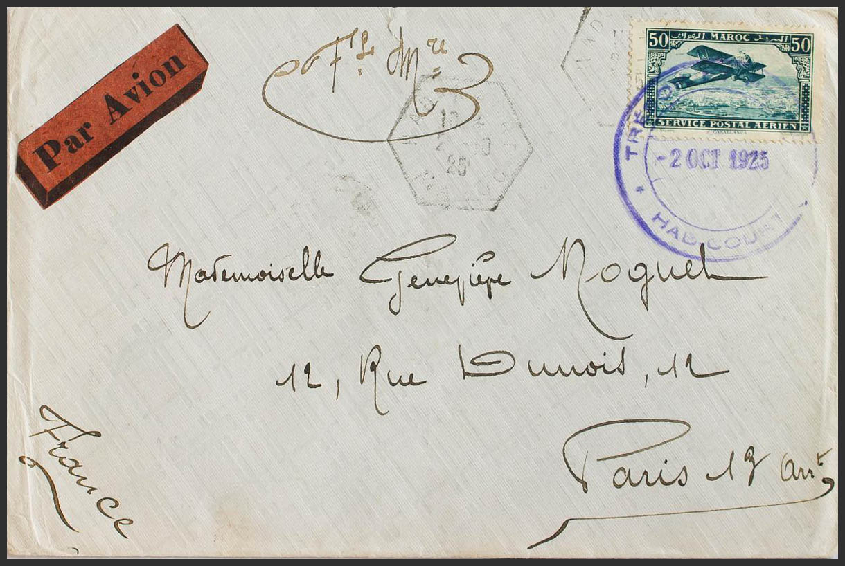 Yvert 3. 1925. 50 cts azul verde. HAD COURT a PARIS. Matasello HAD COURT / MAROC y fechador de franquicia *HAD COURT*, en violeta y al dorso llegada. MAGNIFICA.