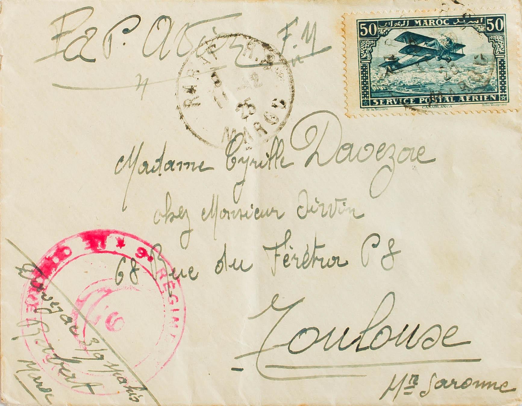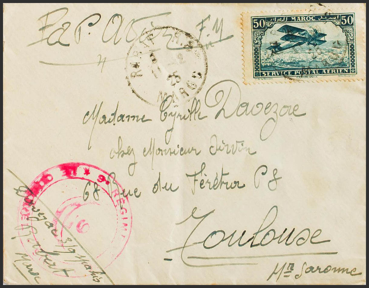 Yvert 3. 1925. 50 cts azul verde (tonalizado). Correo Aéreo de RABAT a TOULOUSSE. En el frente marca de franquicia militar, en violeta. MAGNIFICA.