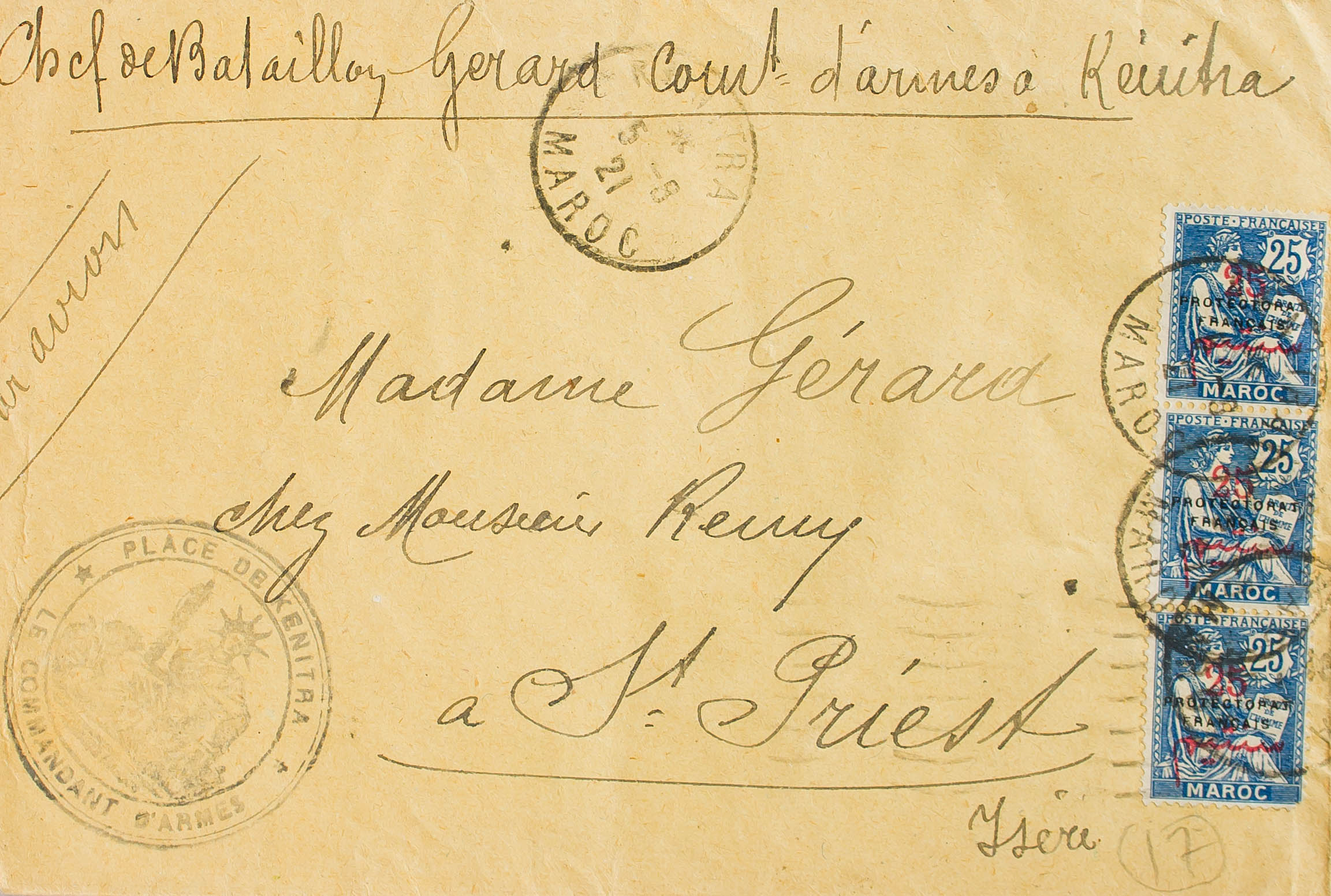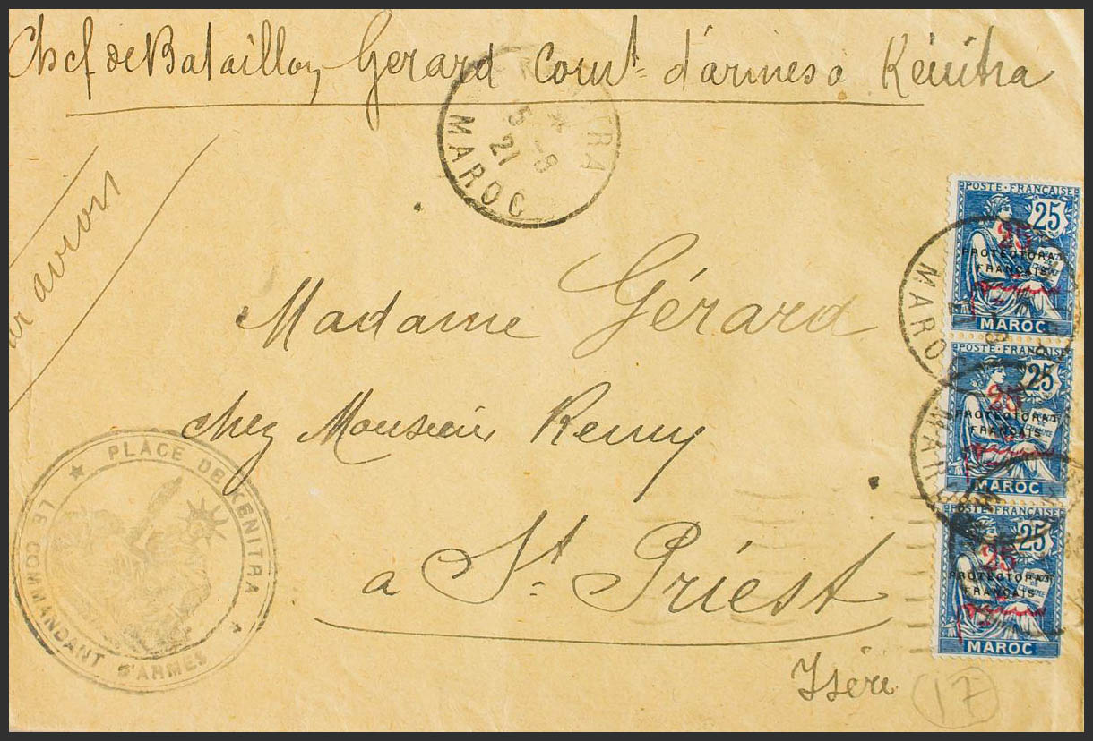 Yvert 44(3). 1921. 25 cts sobre 25 cts azul, tira de tres. KENITRA a SAINT PRIEST. En el frente marca de franquicia militar PLACE DE KENITRA / LE COMMANDANT D´ARMES, al dorso llegada. MAGNIFICA Y RARA.