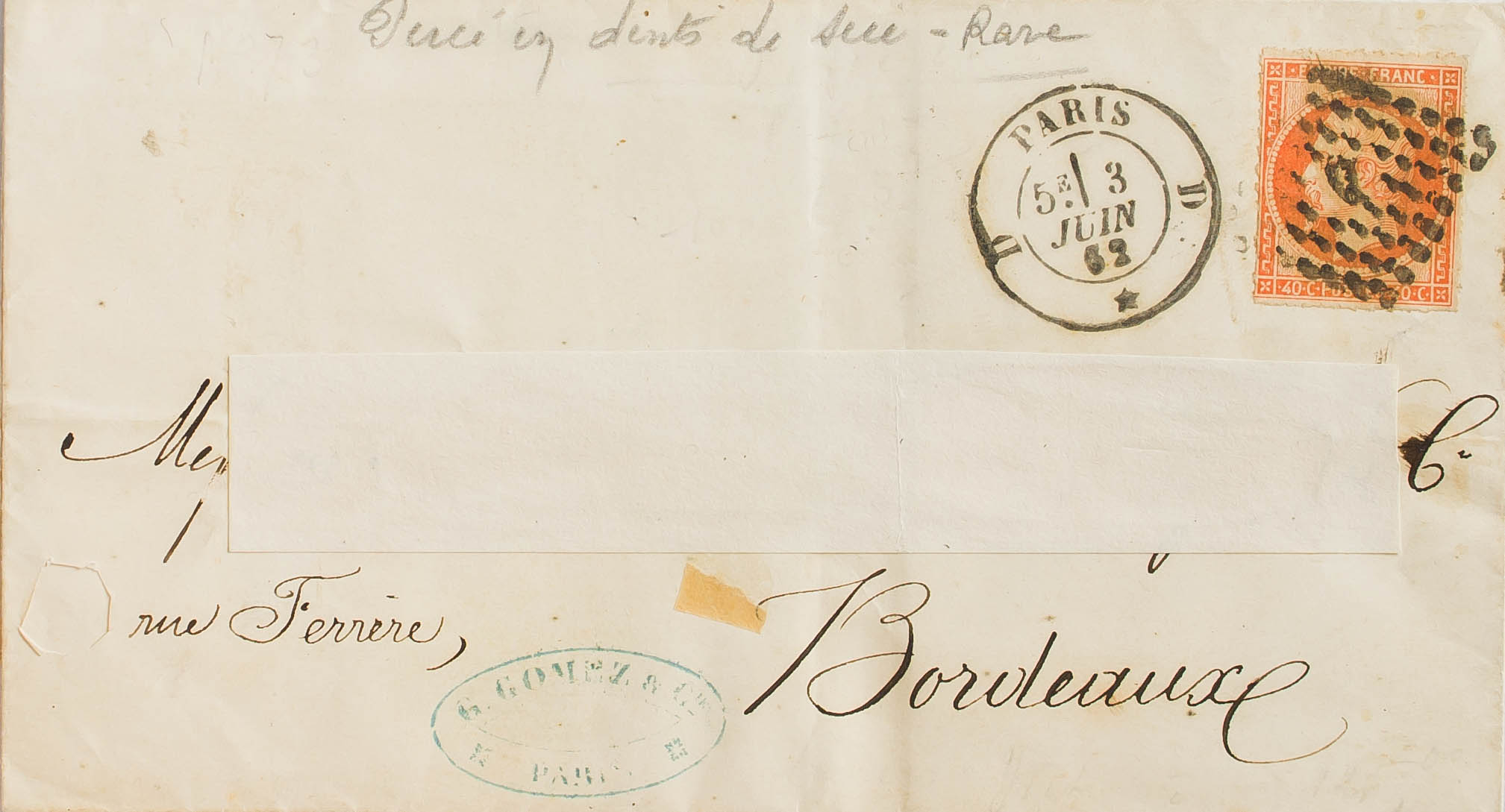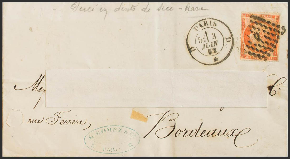 Yvert 16. 1862. 40 cts naranja DENTADO DE SIERRA. PARIS a BURDEOS (dirección recortada). BONITA Y MUY RARA.