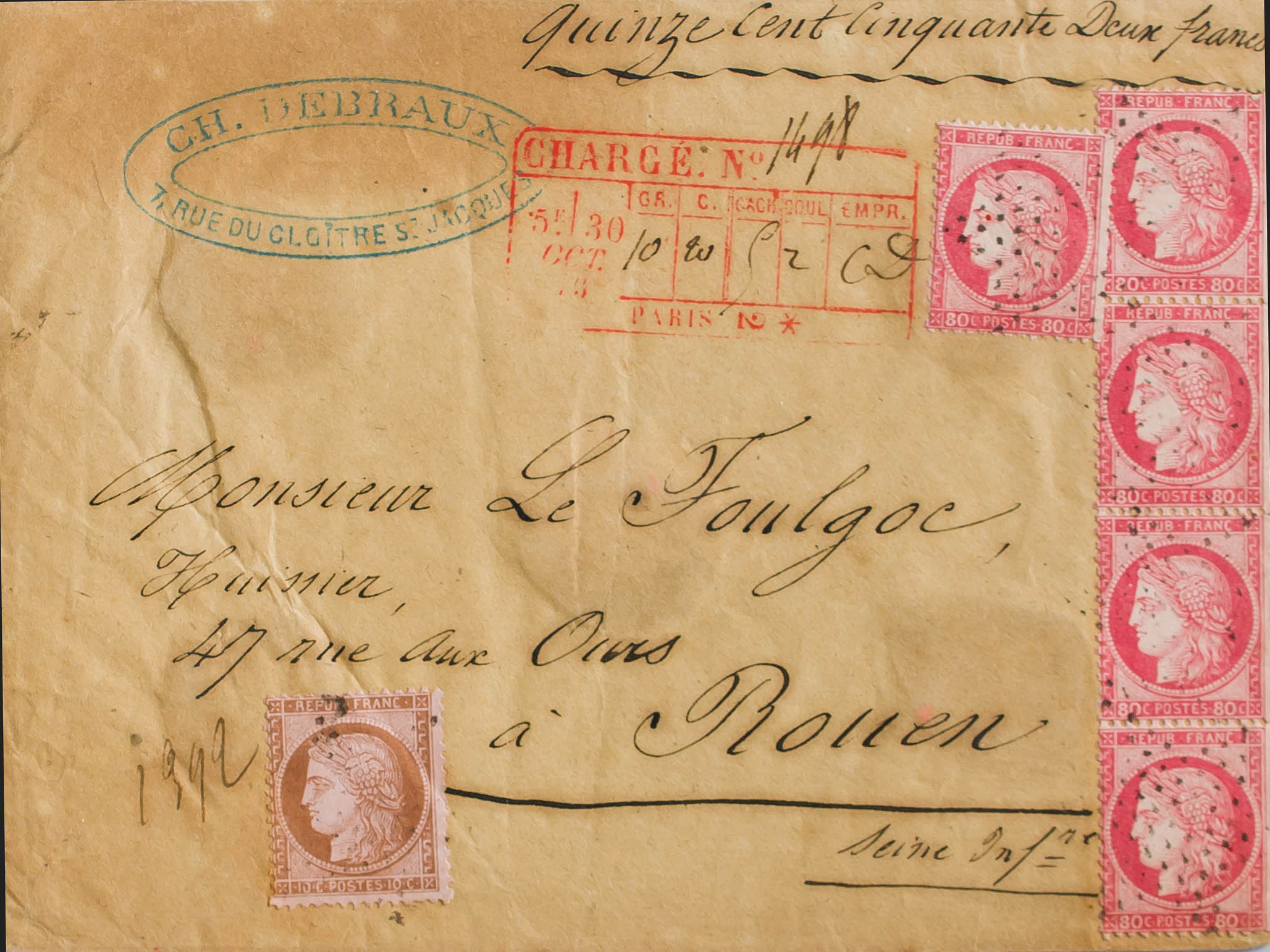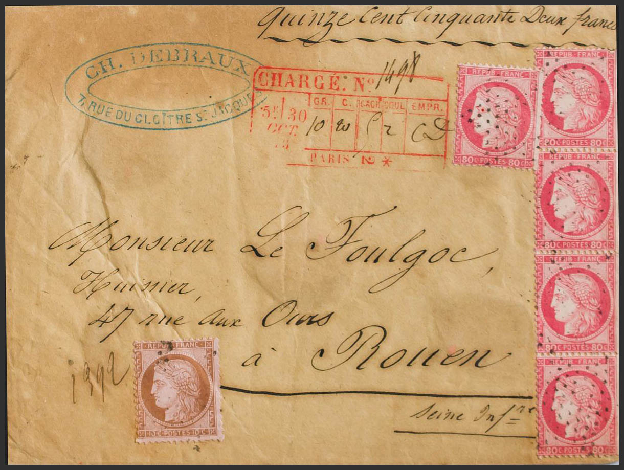 Yvert 57(5), 58. 1875. 80 cts rosa, cinco sellos y 10 cts castaño sobre rosa. Certificado de PARIS a ROUEN. En el frente marca rectangular de certificado PARIS 2, en rojo. MAGNIFICA Y RARA.