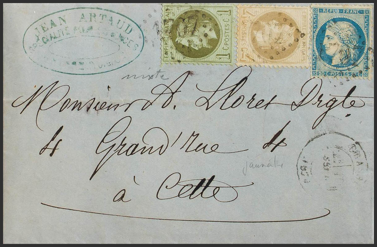 Yvert 37, 25, 27a. 1871. 20 cts azul y 1 cts bronce y 4 cts gris amarillento (Laure). GRASSE a CETTE. Matasello ROMBO DE CIFRAS GRANDES "1707". MAGNIFICA E INUSUAL COMBINACION DE FRANQUEO UTILIZADO DESPUES DEL CAMBIO DE TARIFAS EN SEPTIEMBRE DE 1871.