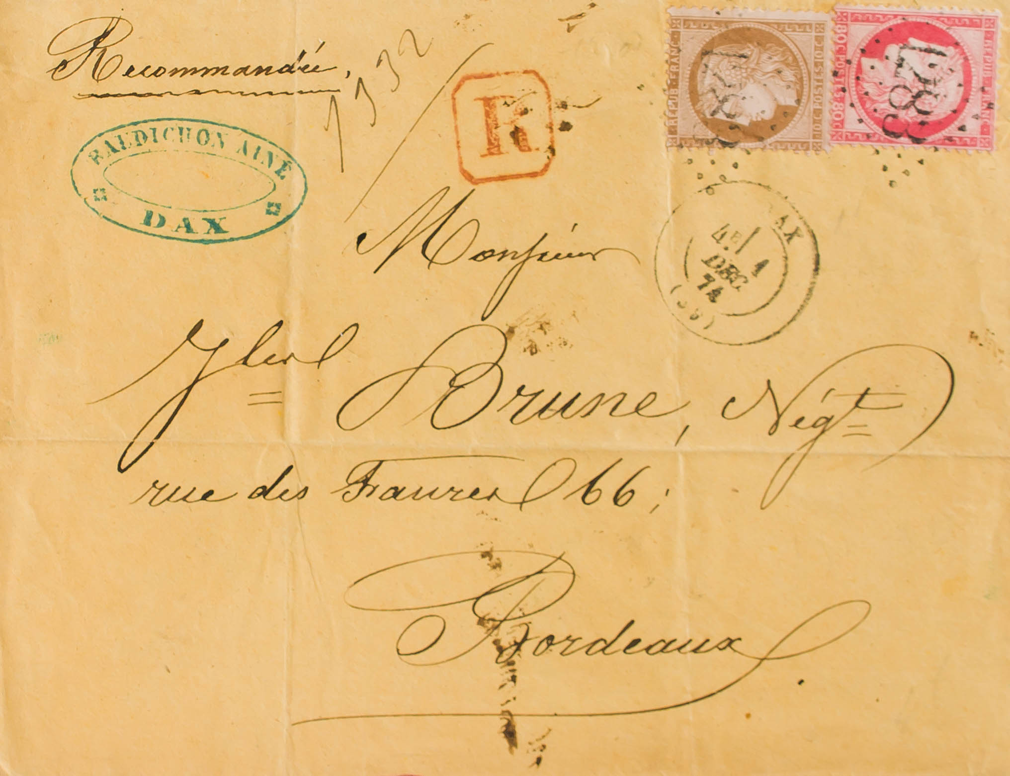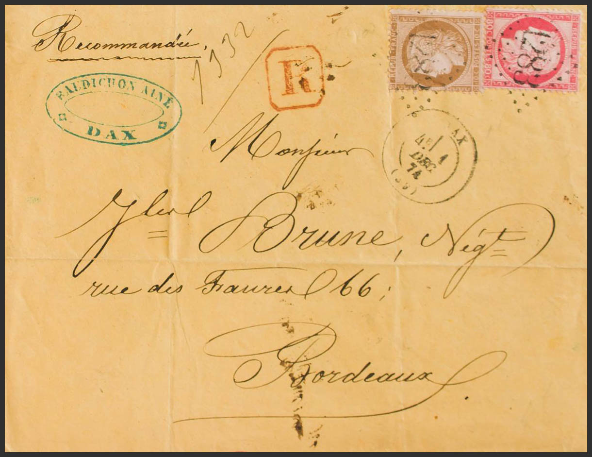 Yvert 57, 58. 1874. 80 cts rosa y 10 cts castaño sobre rosa. Certificado de DAX a BURDEOS. Matasello ROMBO DE CIFRAS GRANDES "1283". MAGNIFICA Y RARA.